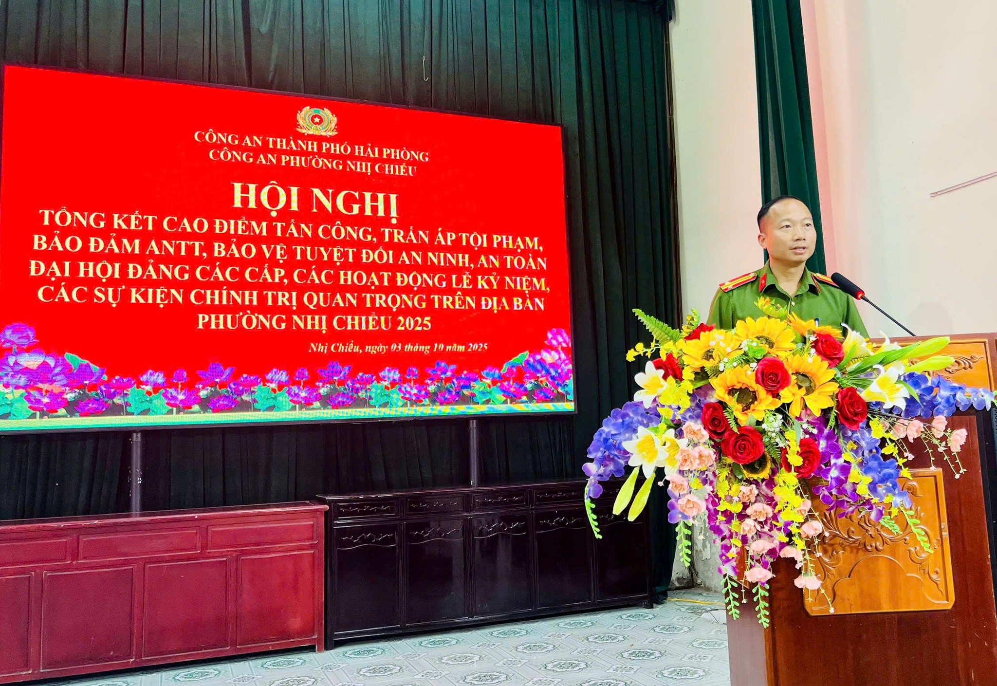 Phát biểu tại hội nghị, lãnh đạo UBND phường Nhị Chiểu ghi nhận, đánh giá cao và biểu dương những thành tích, chiến công của lực lượng Công an phường trong thời gian qua, góp phần giữ vững ổn định tình hình an ninh, trật tự (ANTT) trên địa bàn. Báo cáo tại hội nghị, Trung tá Nguyễn Văn Kiên, Trưởng Công an phường Nhị Chiểu cho biết: Trước khi Công an thành phố phát động đợt cao điểm, đơn vị đã chủ động tham mưu Đảng ủy, UBND phường ban hành nhiều văn bản chỉ đạo, triển khai đồng bộ các biện pháp nghiệp vụ, quyết liệt đấu tranh, trấn áp tội phạm, bảo đảm tuyệt đối an ninh, an toàn các sự kiện chính trị, kinh tế, văn hóa diễn ra trên địa bàn. Trong suốt đợt cao điểm, cán bộ, chiến sĩ Công an phường bám sát cơ sở, trực chiến 24/24 giờ, làm việc xuyên đêm, xuyên lễ với tinh thần “thức cho dân ngủ, gác cho dân vui chơi, lấy niềm vui của nhân dân là hạnh phúc, lẽ sống của mình”, góp phần củng cố hình ảnh đẹp của người chiến sĩ Công an nhân dân trong lòng nhân dân.