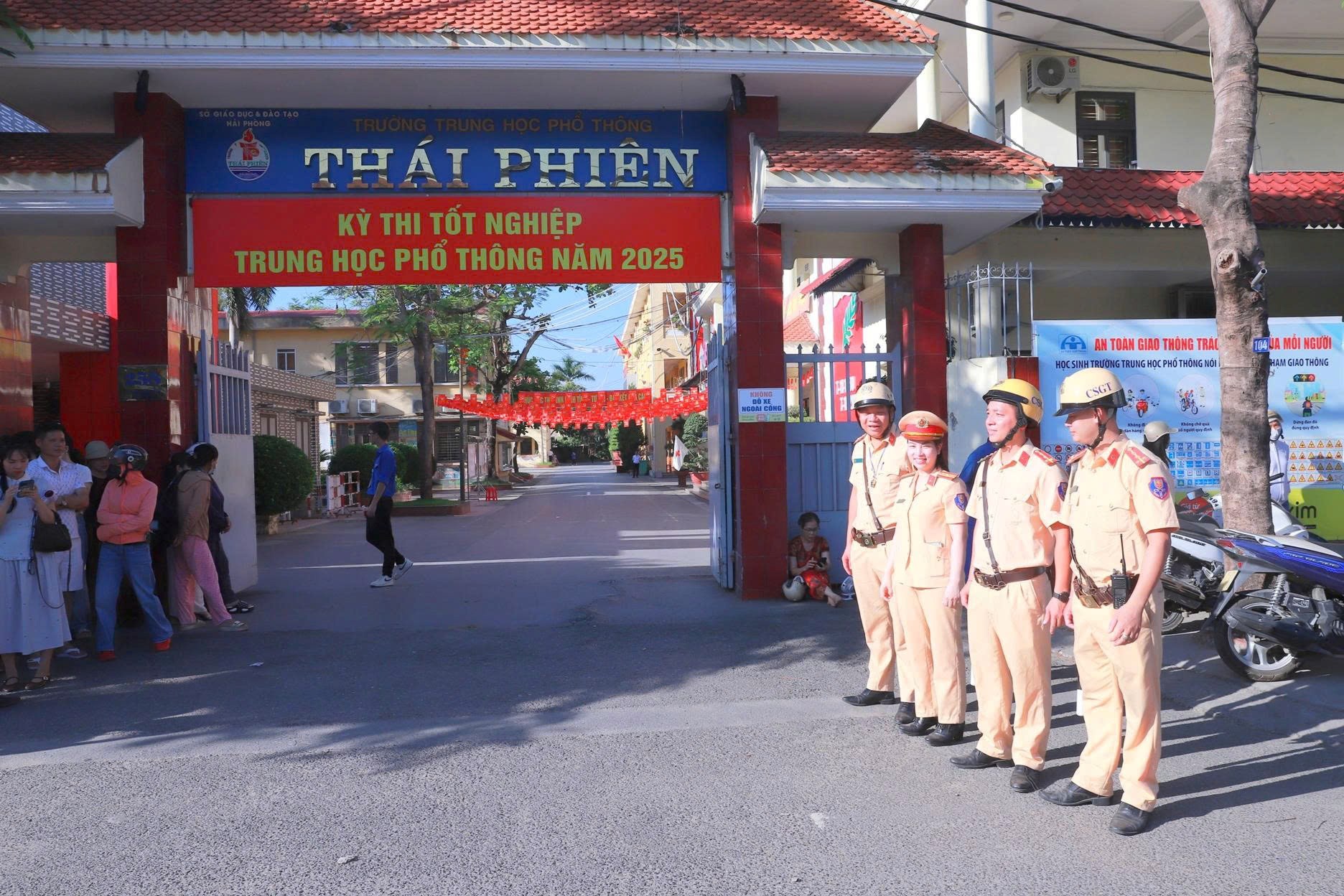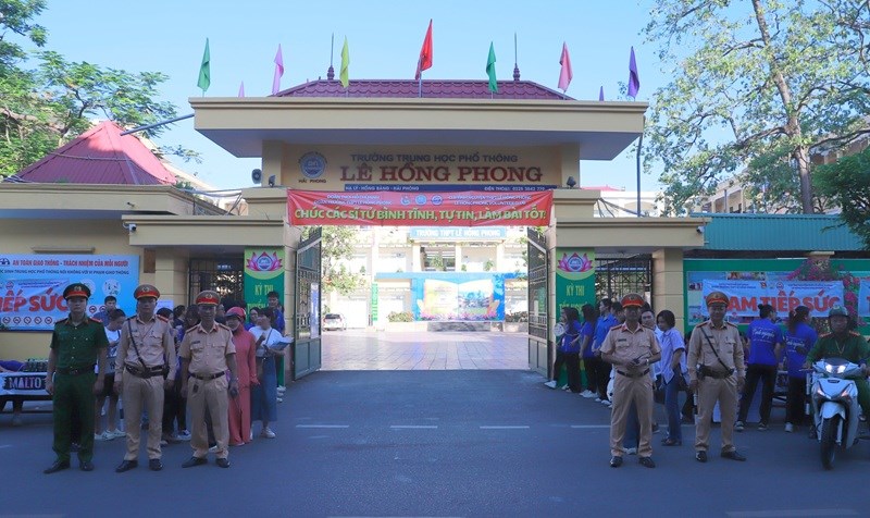 Trung tá Phạm Đức Dương, Phó đội trưởng Phòng CSGT cho biết, 100% CBCS Tổ địa bàn Hồng Bàng đã có mặt từ sớm để điều tiết giao thông tại điểm thi Trường THPT Lê Hồng Phong