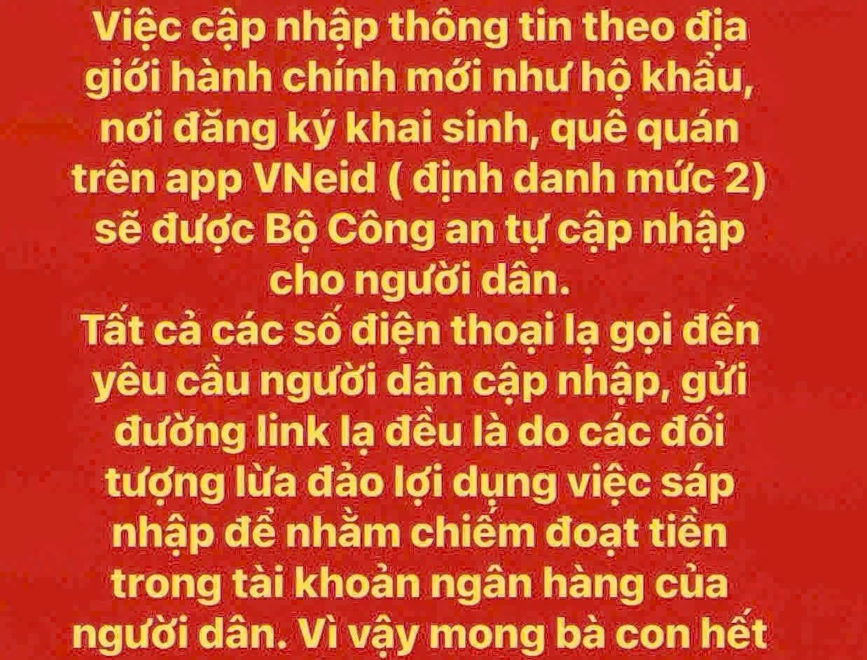 Trong ngày 01/7, nhiều người dân nhận được cuộc gọi tự xưng là Công an địa phương liên hệ báo phải tích hợp thông tin giấy tờ mới vào hệ thống VNeID. Tuy nhiên, đối tượng lại yêu cầu vào VNelD theo đường link/cài phần mềm tải trên kho ứng dụng. Việc cập nhập thông tin theo địa giới hành chính mới như hộ khẩu, nơi đăng ký khai sinh, quê quán trên app VNeID (định danh mức 2) sẽ được Bộ Công an tự cập nhập cho người dân. Do vậy, tất cả các số điện thoại lạ gọi đến yêu cầu người dân cập nhập, gửi đường link đều là do các đối tượng lừa đảo lợi dụng việc sáp nhập nhằm chiếm đoạt tiền trong tài khoản ngân hàng của người dân. Ngoài ra còn nhiều chiêu trò mạo danh khác như giả danh cơ quan thuế, UBND để thu phí; dùng app giả mạo VNeID hoặc Website giả cổng dịch vụ công để lấy OTP; "cập nhật" hoặc "chuyển đổi" ngân hàng... Vì vậy mong Nhân dân hết sức cảnh giác./.
