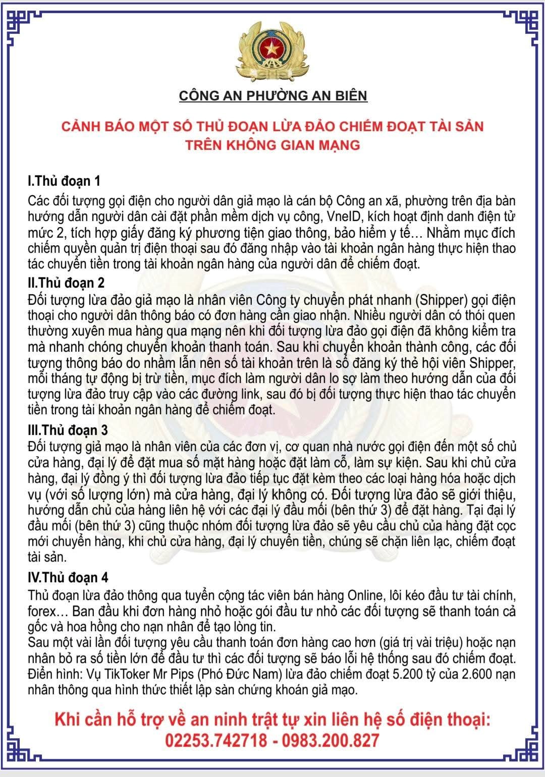 Trước tình hình các đối tượng giả danh cơ quan Công an gọi điện để lừa đảo, CAP An Biên khuyến cáo người dân cần nêu cao tinh thần cảnh giác, đồng thời chủ động tuyên truyền cho người thân, bạn bè về phương thức, thủ đoạn của loại tội phạm này. Để làm việc với người dân, cơ quan Công an sẽ trực tiếp gửi giấy mời, giấy triệu tập hoặc gửi qua Công an địa phương; tuyệt đối không gọi điện yêu cầu người dân chuyển tiền vào tài khoản ngân hàng hoặc cài đặt phần mềm để phục vụ điều tra. Khi phát hiện các trường hợp có dấu hiệu lừa đảo như trên, người dân cần báo ngay cho cơ quan Công an nơi gần nhất.