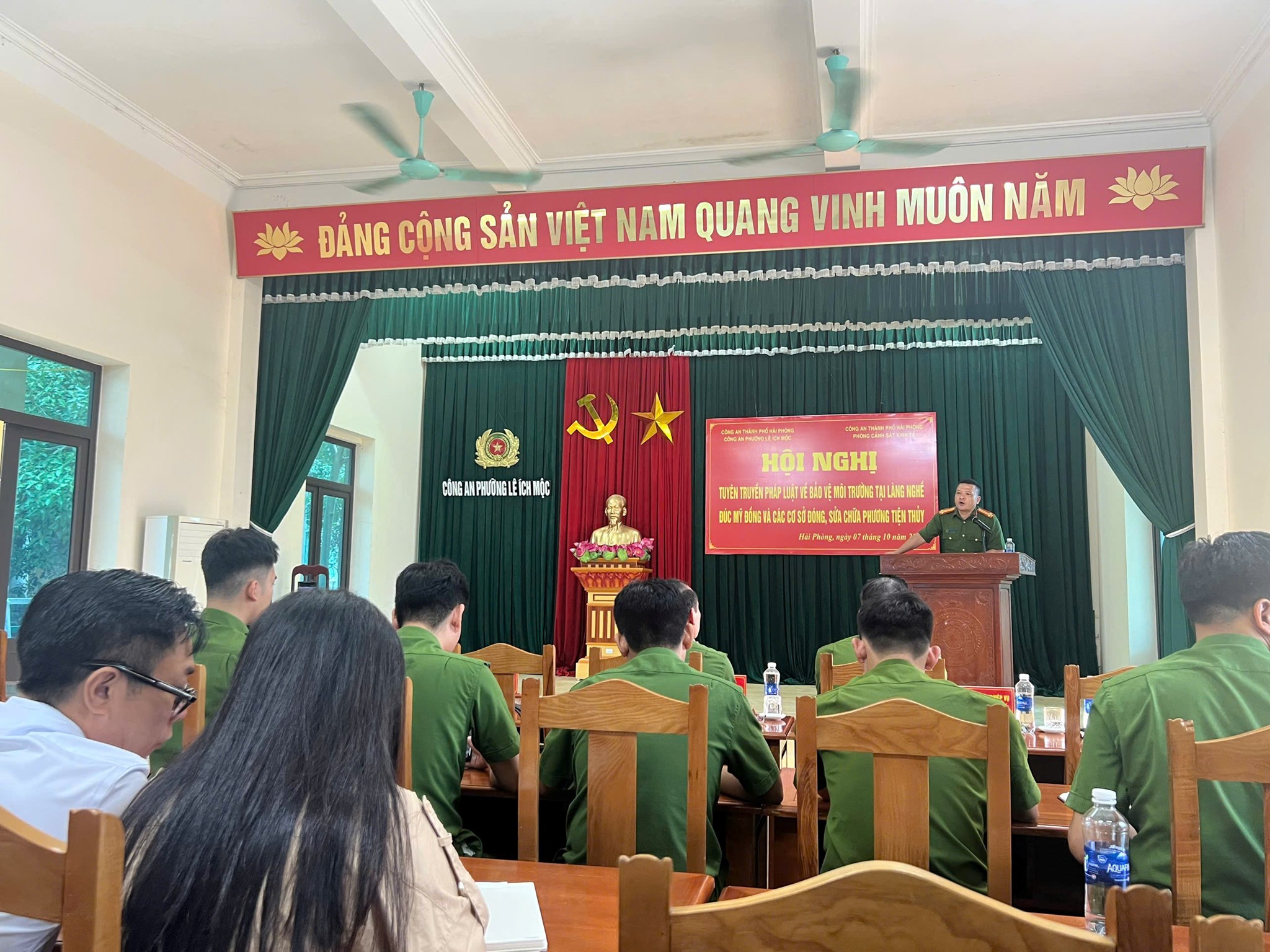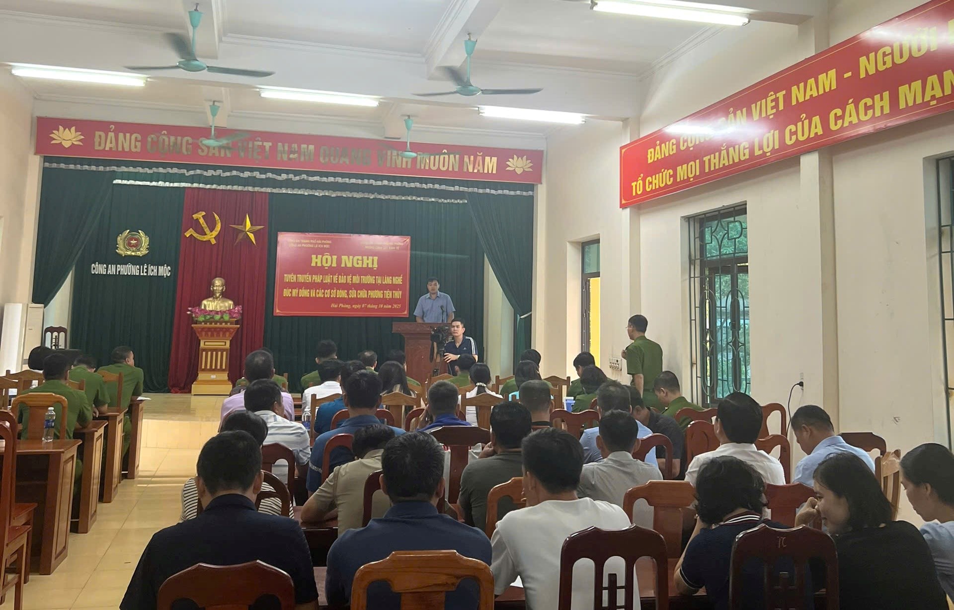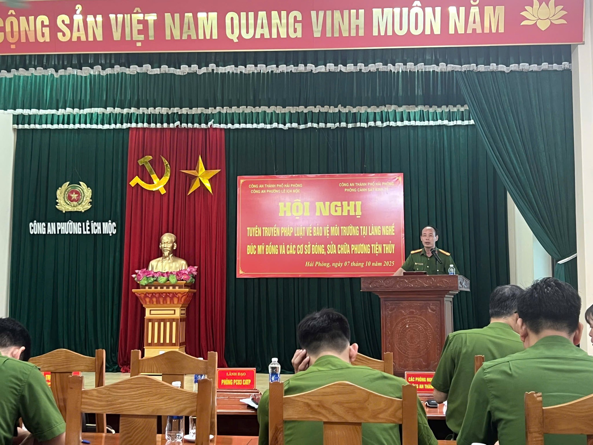 Sáng ngày 07/10/2025, Phòng Cảnh sát kinh tế phối hợp Công an phường Lê Ích Mộc tổ chức Hội nghị tuyên truyền pháp luật về bảo vệ môi trường cho các cá nhân, tổ chức có hoạt động sản xuất, kinh doanh tại các điểm gây ô nhiễm môi trường làng nghề đúc đồng; các cơ sở sửa chữa, đóng mới phương tiện thuỷ trên địa bàn phường Lê Ích Mộc.