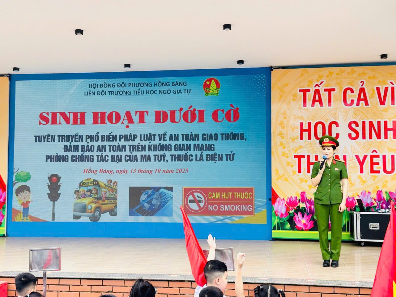 Nhằm nâng cao nhận thức pháp luật và kỹ năng sống cho học sinh, cán bộ, giáo viên trên địa bàn, ngày 13/10/2025, Công an phường Hồng Bàng tổ chức tuyên truyền pháp luật, an toàn giao thông và phòng, chống tệ nạn tại trường Tiểu học Ngô Gia Tự, THCS Ngô Gia Tự và Trường Tiểu học Nguyễn Tri Phương.