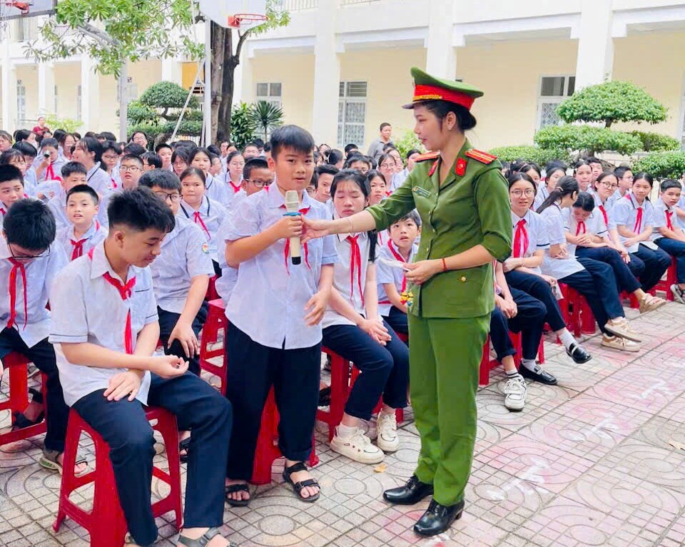Chiều cùng ngày, tại Trường THCS Ngô Gia Tự, Công an phường đã tổ chức buổi tuyên truyền trực tiếp cho 71 cán bộ, giáo viên, công nhân viên và 1.354 học sinh tại cơ sở 1, đồng thời kết nối trực tuyến với cơ sở 2 để đảm bảo toàn bộ học sinh đều được tiếp cận nội dung giáo dục pháp luật. Các nội dung tập trung hướng dẫn học sinh tuân thủ luật giao thông, đội mũ bảo hiểm đúng cách, đi đúng phần đường và nhận diện các tình huống nguy hiểm khi tham gia giao thông; Cảnh báo các hành vi lừa đảo, xâm hại qua mạng xã hội, hướng dẫn học sinh sử dụng Internet an toàn và có trách nhiệm, cảnh báo nguy cơ sức khỏe, ảnh hưởng tâm lý và pháp lý liên quan đến việc sử dụng thuốc lá điện tử trong học đường...
