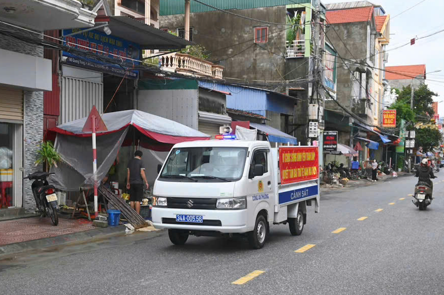 Xe tuyên truyền lưu động của Công an phường Kinh Môn trên các tuyến phố, vận động người dân thực hiện nghiêm quy định về trật tự đô thị