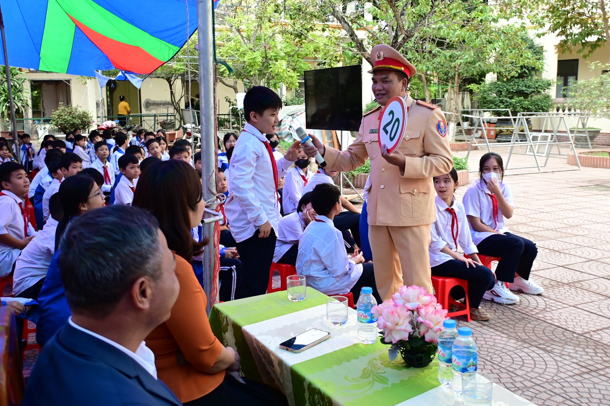 Trong buổi tuyên truyền, Trung tá Hoàng Bá Mạnh - Phó đội trưởng Đội Cảnh sát giao thông- trật tự thông tin về tình hình an toàn giao thông toàn quốc, thành phố và huyện. Điển hình là một số vụ tai nạn giao thông liên quan học sinh xảy ra trên địa bàn thành phố. Tại buổi tuyên truyền, Trung tá Hoàng Bá Mạnh cũng đã hướng dẫn các em học sinh cách sử dụng phương tiện giao thông đúng độ tuổi, cách đội mũ bảo hiểm đúng cách, giới thiệu về 5 nhóm biển báo hiệu đường bộ, kỹ năng tham gia giao thông an toàn… Nhà trường và Đội Cảnh sát giao thông- trật tự tổ chức tìm hiểu về các loại biển báo giao thông đồng thời trao phần thưởng cho các học sinh trả lời đúng ý nghĩa của các loại biển báo.
