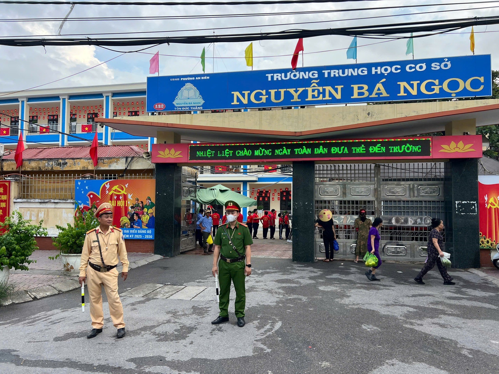 Đội Cảnh sát giao thông đường bộ số 1 phối hợp Công an phường đảm bảo trật tự an toàn giao thông tại trường THCS Nguyễn Bá Ngọc