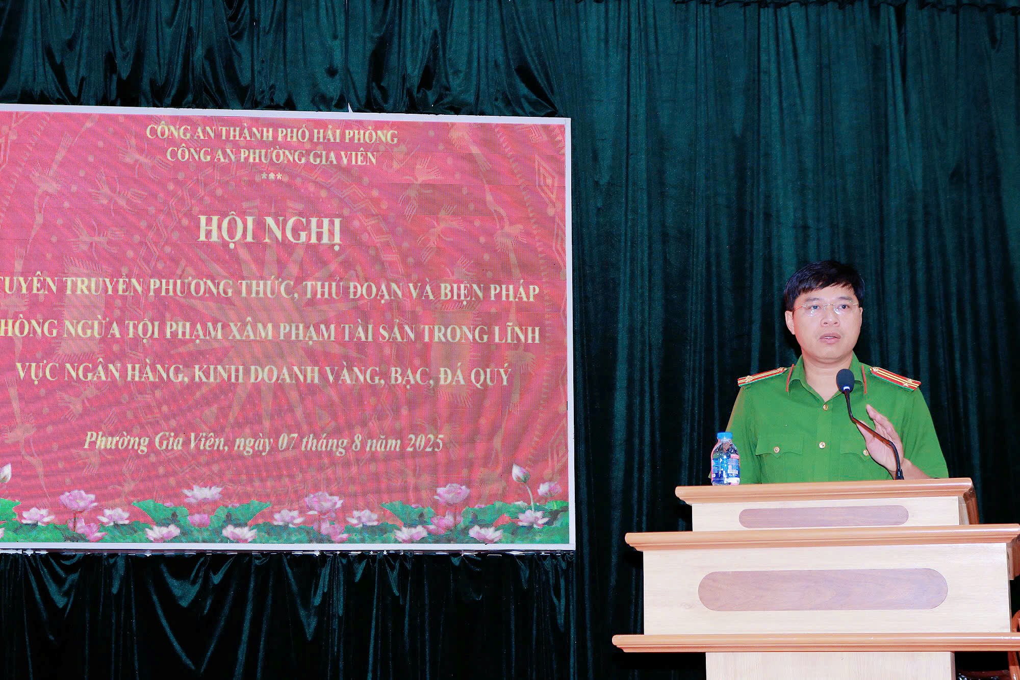 Thực hiện Kế hoạch số 870/KH-CAHP-PC02 ngày 07/7/2025 của Giám đốc Công an thành phố Hải Phòng về tổ chức tuyên truyền, phổ biến phương thức, thủ đoạn và biện pháp phòng ngừa tội phạm xâm phạm tài sản trong lĩnh vực ngân hàng, kinh doanh vàng, bạc, đá quý, Công an phường Gia Viên đã tổ chức Hội nghị tuyên truyền vào chiều 7/8. Tham dự và chỉ đạo hội nghị có đồng chí Trung tá Hà Văn Duy, Phó Trưởng Công an phường Gia Viên. Cùng dự hội nghị có tập thể Ban Chỉ huy Công an phường, chỉ huy các tổ công tác chuyên môn; toàn bộ lực lượng Cảnh sát hình sự, Cảnh sát khu vực; đại diện các tổ dân phố, lực lượng an ninh cơ sở và đại diện các chi nhánh ngân hàng, tổ chức tín dụng, cửa hàng vàng, bạc, đá quý trên địa bàn phường.