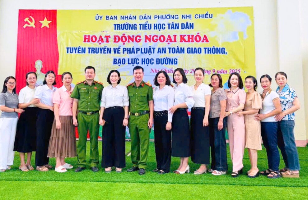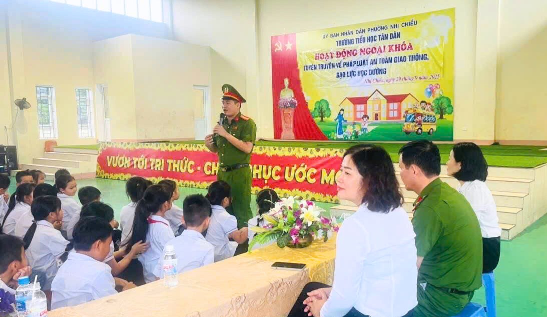 Thực hiện nghiêm Chỉ thị số 31/CT-TTg ngày 21/12/2023 của Thủ tướng Chính phủ về tăng cường công tác bảo đảm trật tự an toàn giao thông (ATGT) cho học sinh, chỉ đạo của Công an thành phố Hải Phòng, sáng 29/9/2025, Trường Tiểu học Tân Dân phối hợp Công an phường Nhị Chiểu tổ chức hoạt động ngoại khóa với chủ đề “Tuyên truyền pháp luật về An toàn giao thông và phòng, chống bạo lực học đường” cho toàn thể cán bộ, giáo viên và 333 học sinh.