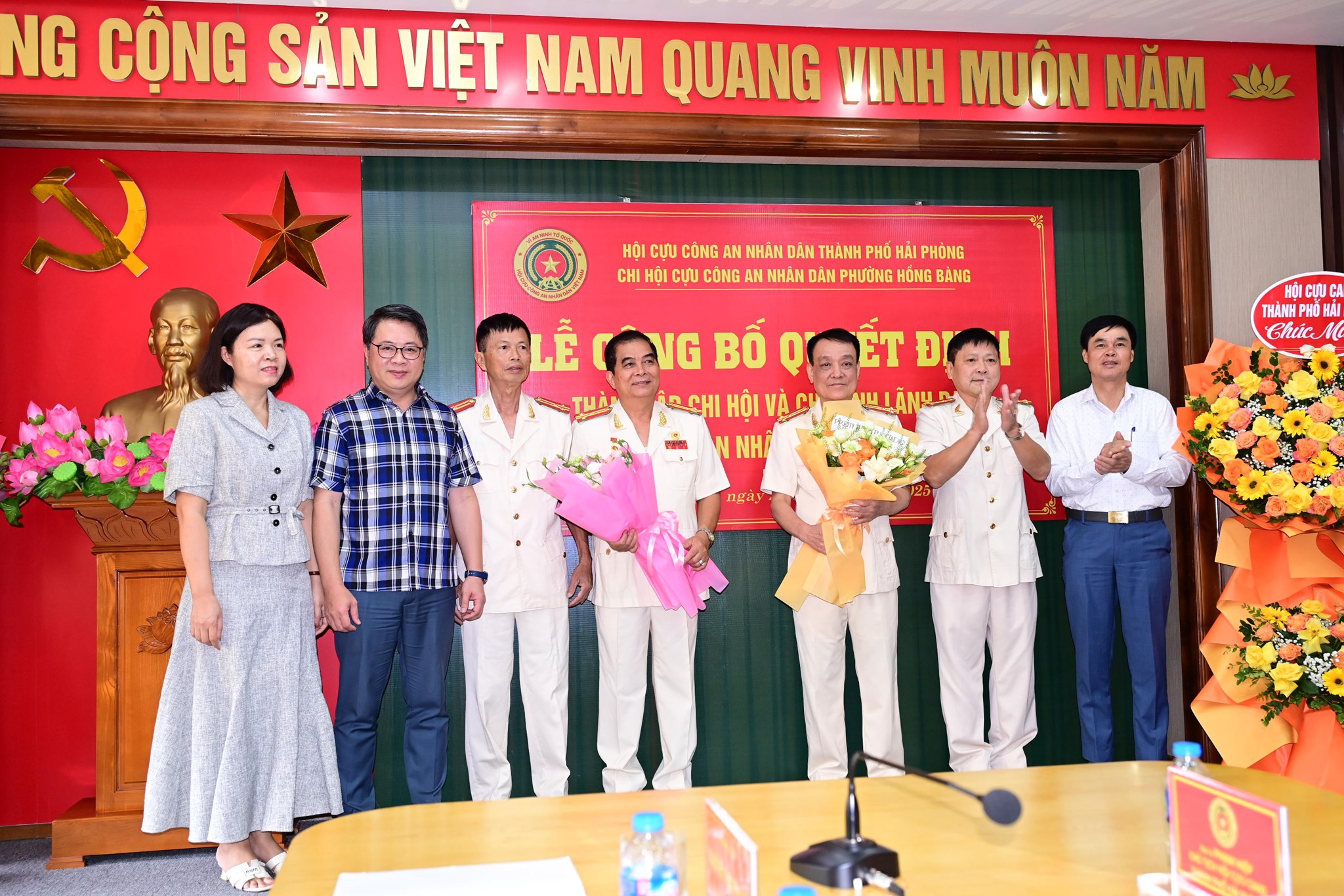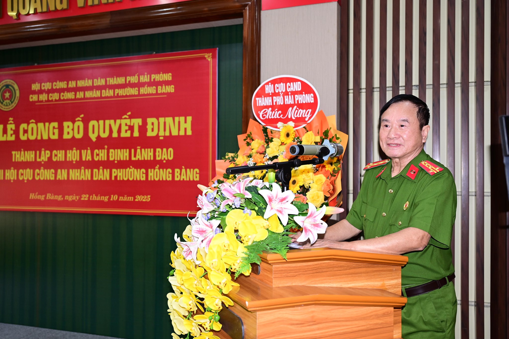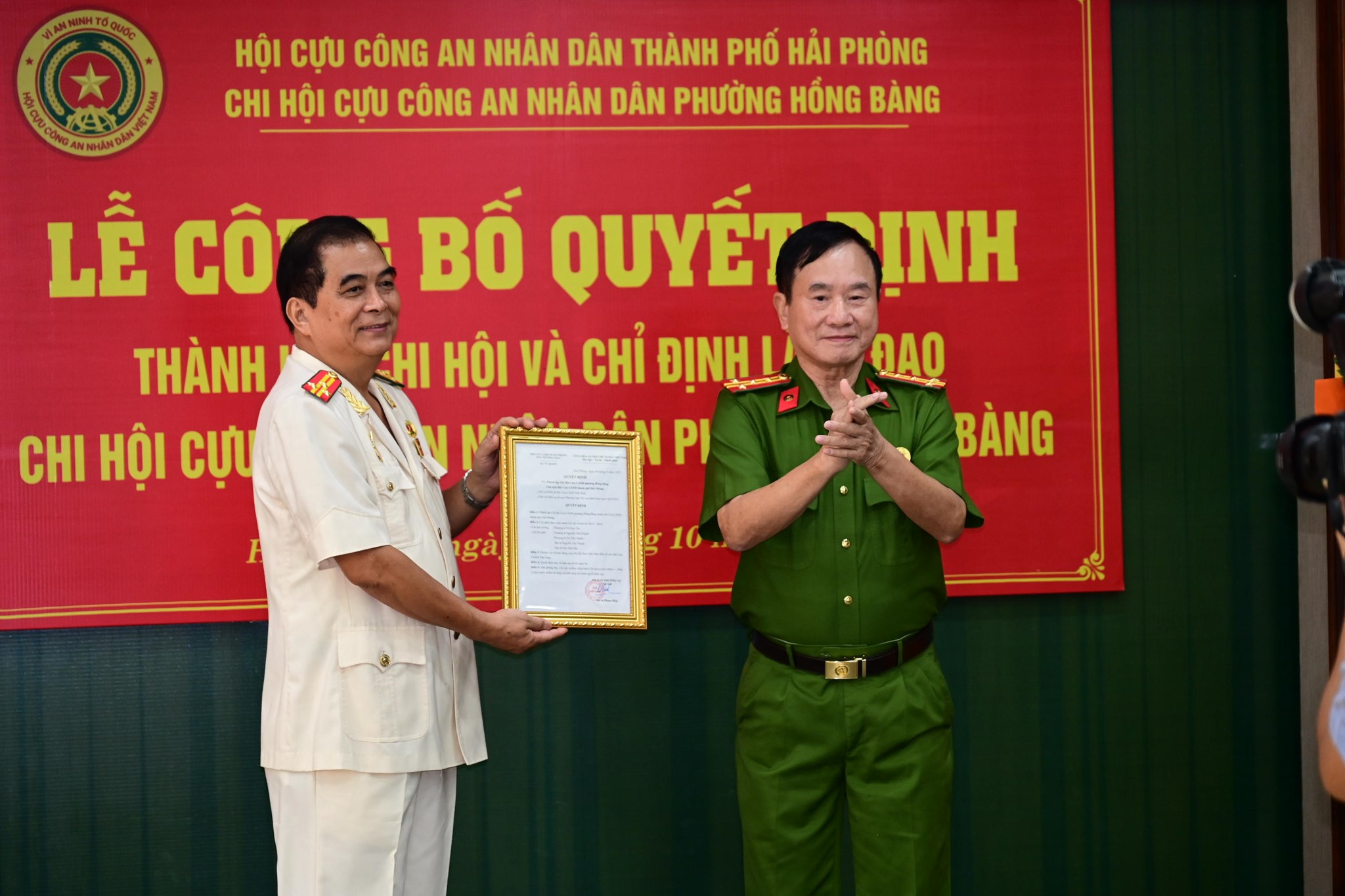Buổi lễ đã công bố Quyết định số 75/QĐ-BTV ngày 8/9/2025 của Chủ tịch Hội Cựu CAND thành phố về việc thành lập Chi hội Cựu CAND phường Hồng Bàng thuộc Hội Cựu CAND thành phố Hải Phòng và chỉ định đồng chí Thượng tá Vũ Duy Tài làm Chi hội trưởng Chi hội Cựu CAND phường Hồng Bàng; chỉ định các đồng chí: Đại tá Nguyễn Văn Thanh, Đại tá Chu Văn Dấu, Thượng tá Nguyễn Văn Huỳnh và Thượng tá Vũ Tiến Thành làm Chi hội phó Chi hội Cựu CAND phường Hồng Bàng, nhiệm kỳ 2025 – 2030.