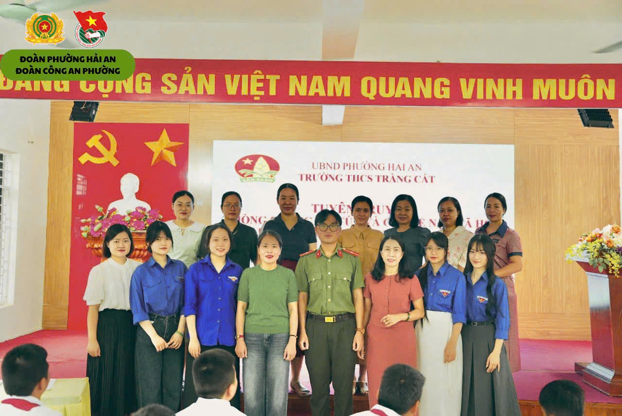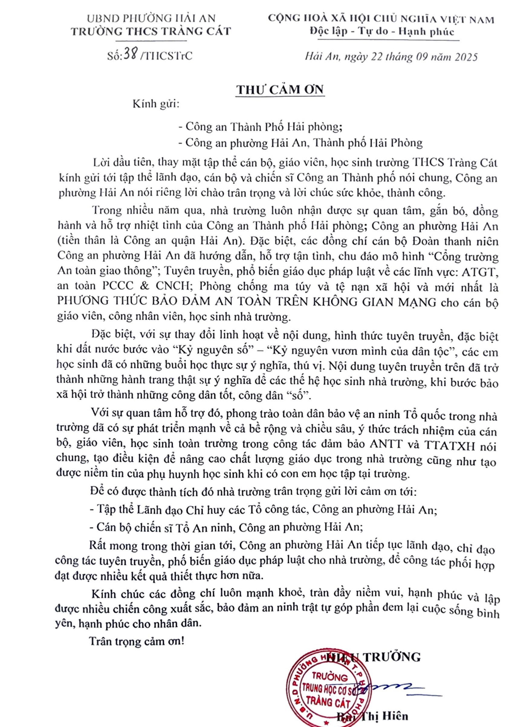 Sáng ngày 22/9/2025, Đoàn thanh niên Công an phường Hải An phối hợp nhà trường THCS Tràng Cát tổ chức buổi ngoại khoá với chủ đề :" TUYÊN TRUYỀN PHƯƠNG THỨC BẢO ĐẢM AN TOÀN TRÊN KHÔNG GIAN MẠNG" cho 200 giáo viên, học sinh nhà trường. Đây là một nội dung mới, khi được tiếp cận tuyên truyền, các học sinh rất thích thú với các nội dung được truyền đạt. Đa số toàn bộ kiến thức đều được mô hình hoá, cụ thể hoá bằng các ví dụ minh hoạ trực quan, rất dễ hiểu và hữu ích. BGH nhà trường đánh giá nội dung tuyên truyền của CAP Hải An là một trong những hành trang thiết thực, cơ bản để thế hệ học sinh nhà trường bước vào xã hội với tư cách một công dân thời đại chuyển đổi số. Nội dung thư như sau: