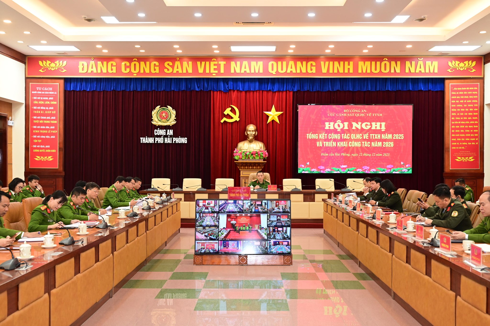 Sáng 22/12/2025, tại Hà Nội, Bộ Công an tổ chức Hội nghị tổng kết công tác quản lý hành chính về trật tự xã hội (QLHC về TTXH) năm 2025 và triển khai công tác năm 2026 theo hình thức trực tiếp tại hội trường Bộ Công an và trực tuyến tới Công an các địa phương. Thượng tướng Nguyễn Văn Long, Thứ trưởng Bộ Công an dự và chỉ đạo Hội nghị.