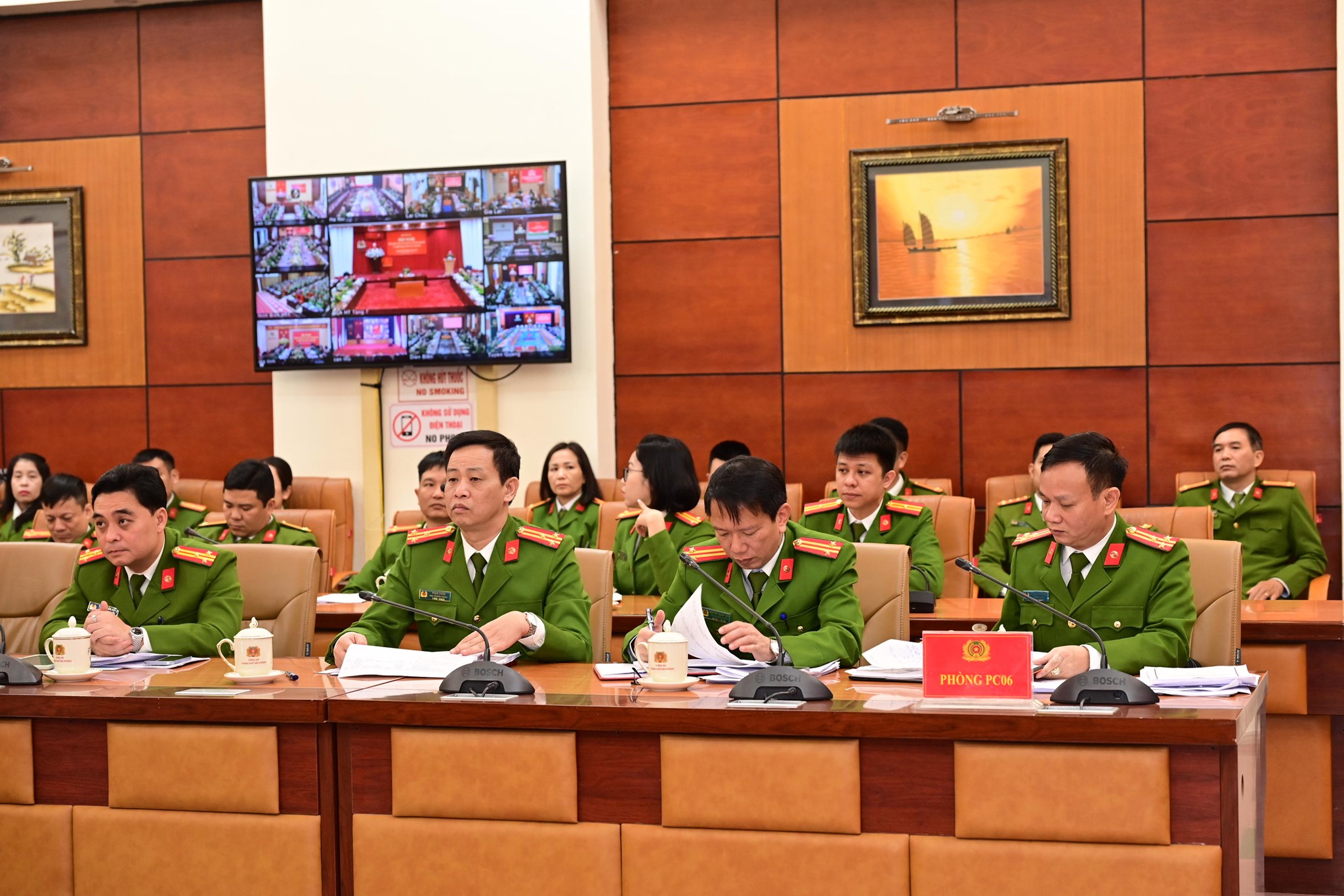 Đại tá Phạm Chí Hiếu - Phó Giám đốc CATP, các phòng nghiệp vụ và Công an cấp xã dự tại điểm cầu Công an thành phố và các điểm cầu