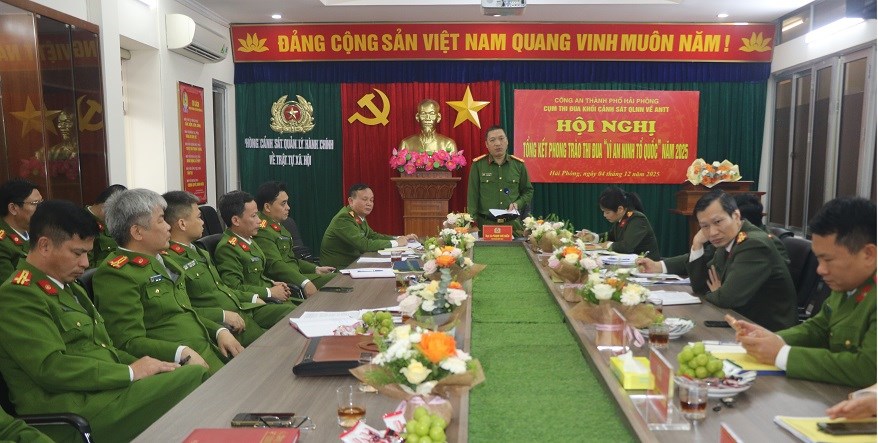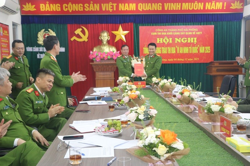 Chiều 04/12/2025, Cụm thi đua Khối Cảnh sát quản lý nhà nước về an ninh trật tự (QLNN về ANTT) Công an Hải Phòng tổ chức Hội nghị tổng kết phong trào thi đua “Vì ANTQ” năm 2025. Đại tá Phạm Chí Hiếu – Phó Giám đốc CATP dự, chủ trì hội nghị. Cùng dự có lãnh đạo một số phòng nghiệp vụ chức năng CATP; Thượng tá Vũ Dương Tường – Trưởng Phòng Cảnh sát QLHC về TTXH, Cụm trưởng Cụm thi đua năm 2025 và lãnh đạo các đơn vị trong cụm thi đua.
