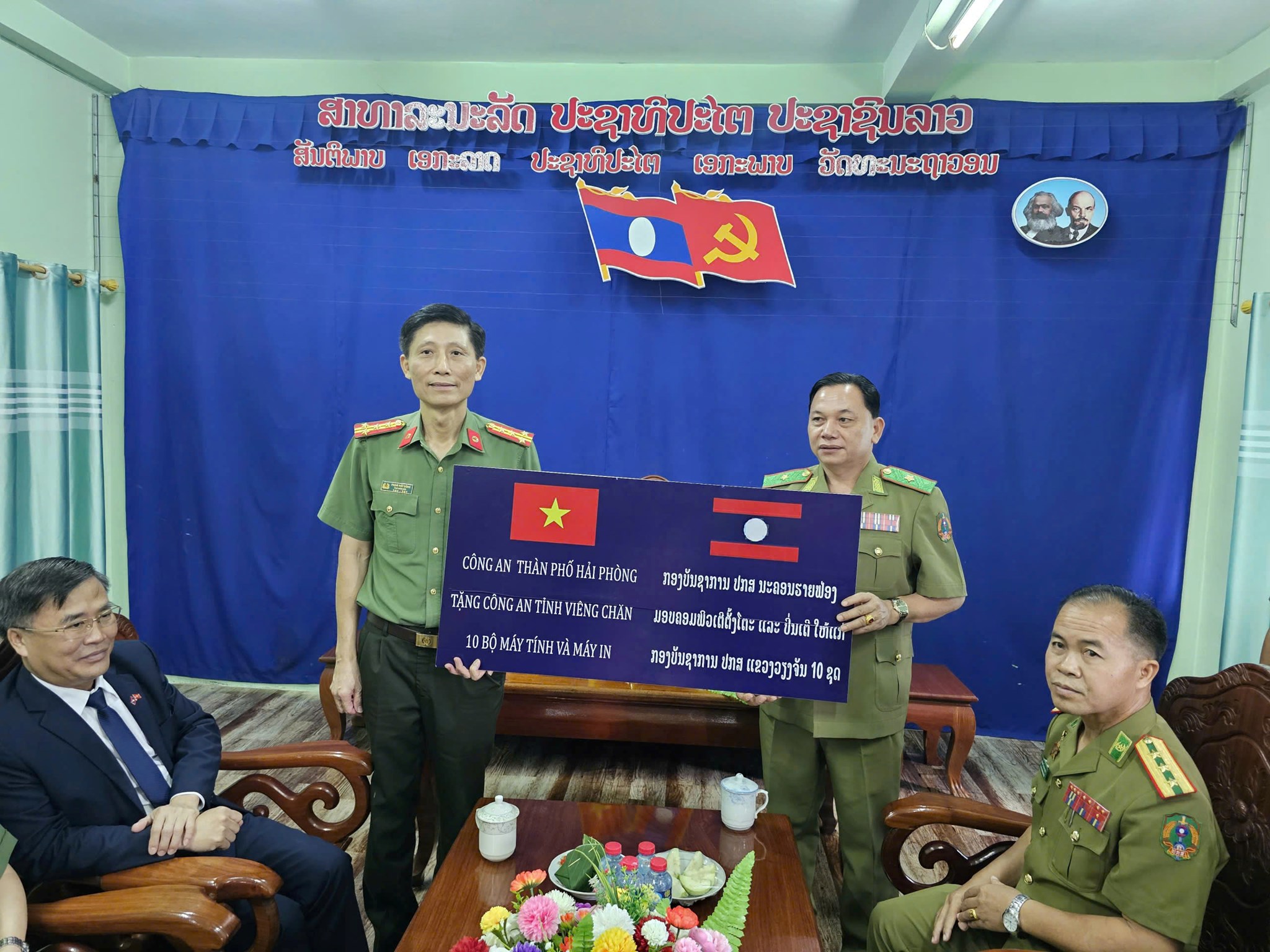 Trong chuyến công tác, Đoàn đại biểu Công an thành phố Hải Phòng đã trao tặng Công an tỉnh Viêng Chăn 10 bộ máy tính và máy in với tổng trị giá 150 triệu đồng. Đoàn cũng đã tới thăm Nhà truyền thống Công an tỉnh Viêng Chăn – công trình được xây dựng với sự hỗ trợ kinh phí từ Công an tỉnh Hải Dương (trước đây).