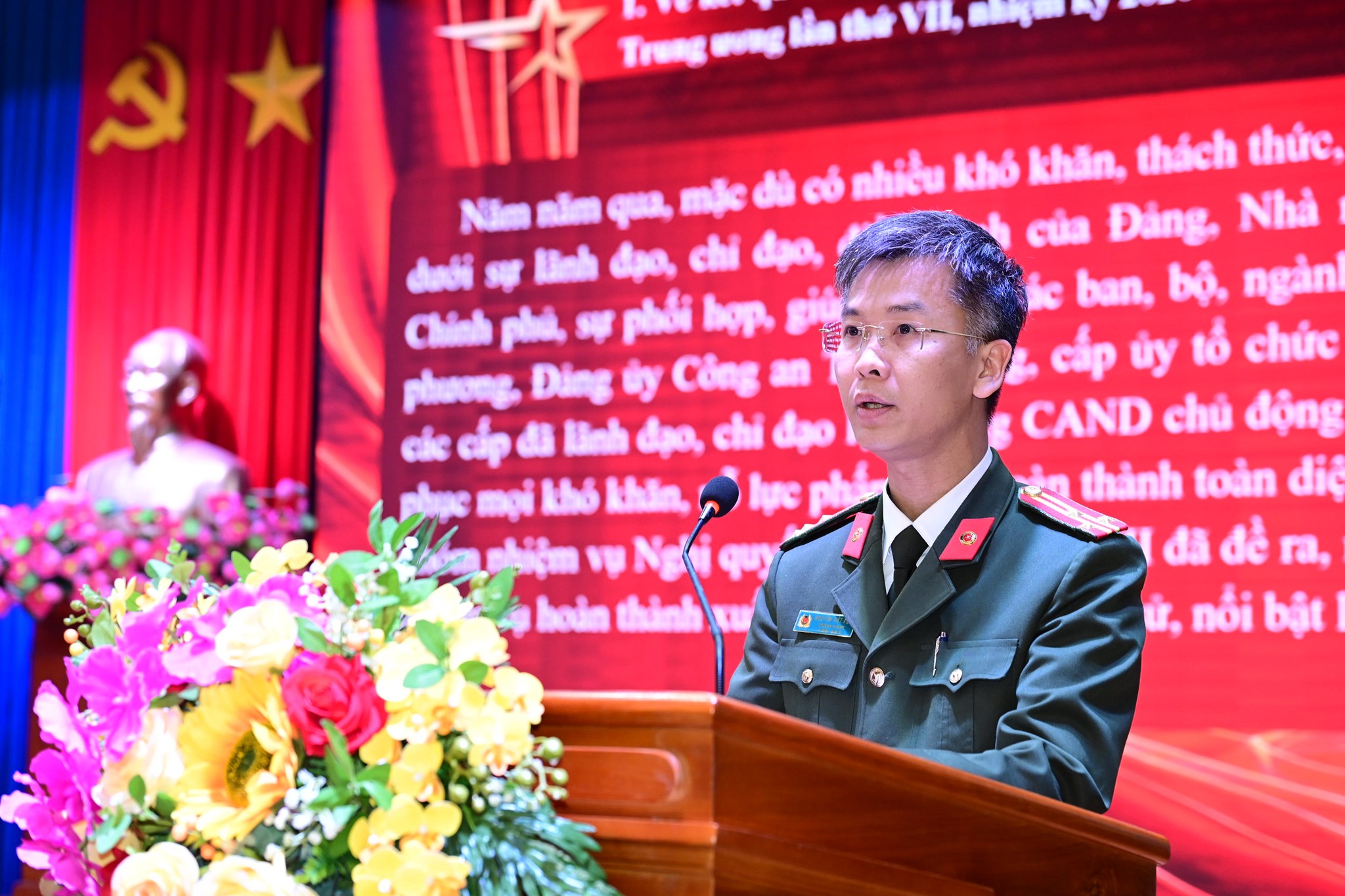 Thượng tá Nguyễn Việt Anh, Chánh Văn phòng Đảng ủy CATP, Trưởng Phòng Tham mưu CATP trình bày nội dung quán triệt các nghị quyết