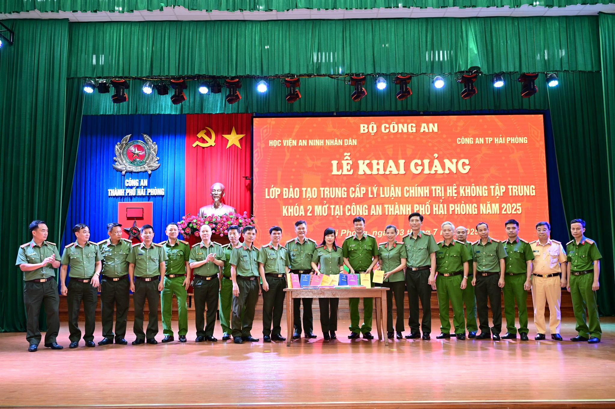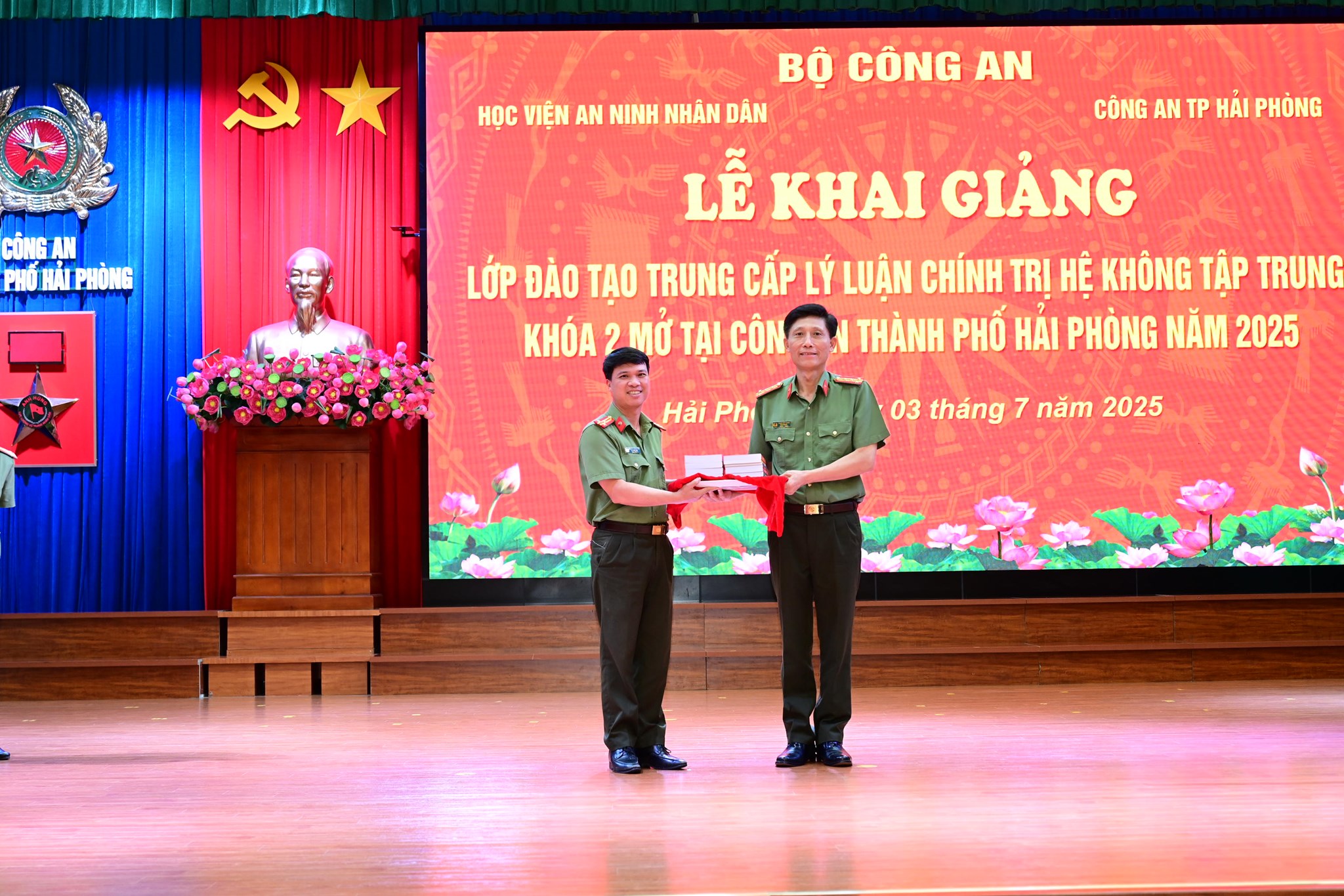 Chiều 3/7/2025, CATP Hải Phòng phối hợp với Học viện An ninh nhân dân (Bộ Công an) tổ chức Lễ khai giảng lớp đào tạo trung cấp lý luận chính trị hệ không tập trung tại CATP Hải Phòng. Tham dự lễ khai giảng có các đồng chí: Đại tá Phạm Viết Dũng, Phó Bí thư Đảng ủy, Phó giám đốc CATP; Thượng tá PGS.TS Nguyễn Hồng Thái, Phó giám đốc Học viện An ninh nhân dân. Cùng dự có 157 học viên là CBCS đang công tác tại CATP Hải Phòng và Công an tỉnh Hưng Yên.