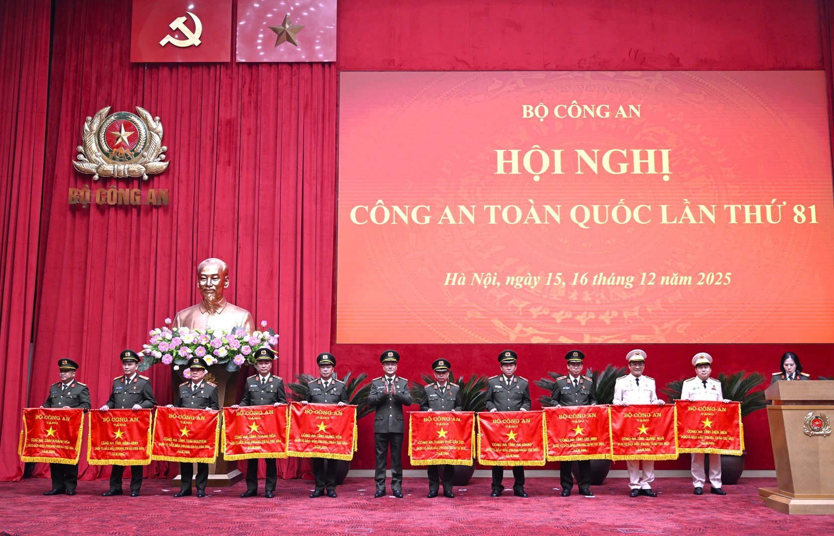 Thứ trưởng Phạm Thế Tùng trao Cờ thi đua của Bộ Công an tặng các đơn vị: Công an tỉnh Điện Biên; Công an tỉnh Quảng Ngãi; Công an tỉnh Tây Ninh; Công an tỉnh An Giang; Công an thành phố Cần Thơ; Công an tỉnh Hưng Yên; Công an tỉnh Thanh Hóa; Công an tỉnh Thái Nguyên; Công an tỉnh Ninh Bình; Công an tỉnh Khánh Hòa.