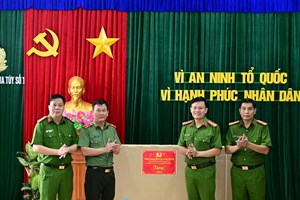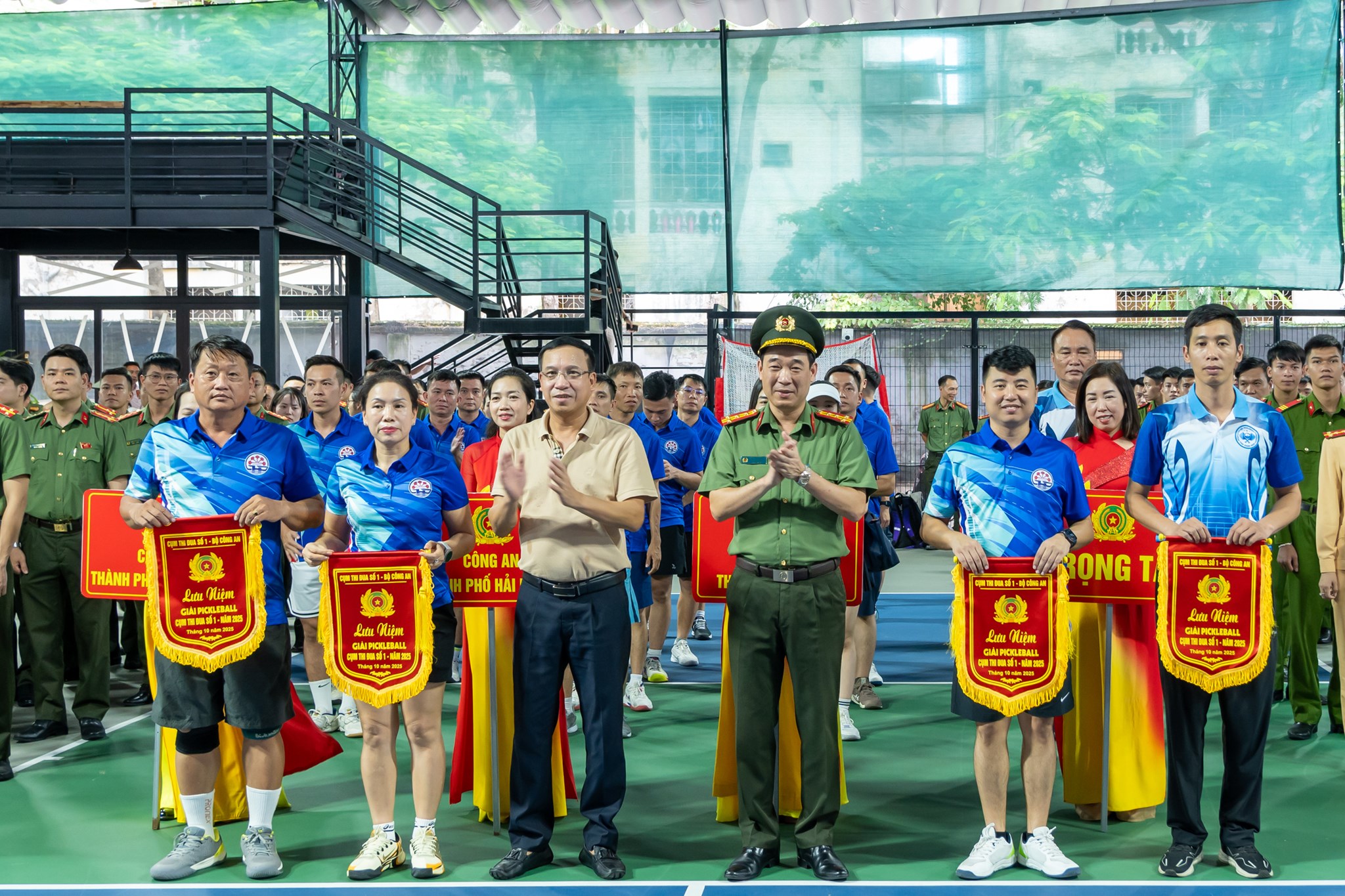 Đại tá Bùi Mạnh Hùng - Phó Giám đốc CATP, Đại tá Lê Đức Thành - Phó Giám đốc CATP trao cờ lưu niệm tặng các đội tham gia giải đấu