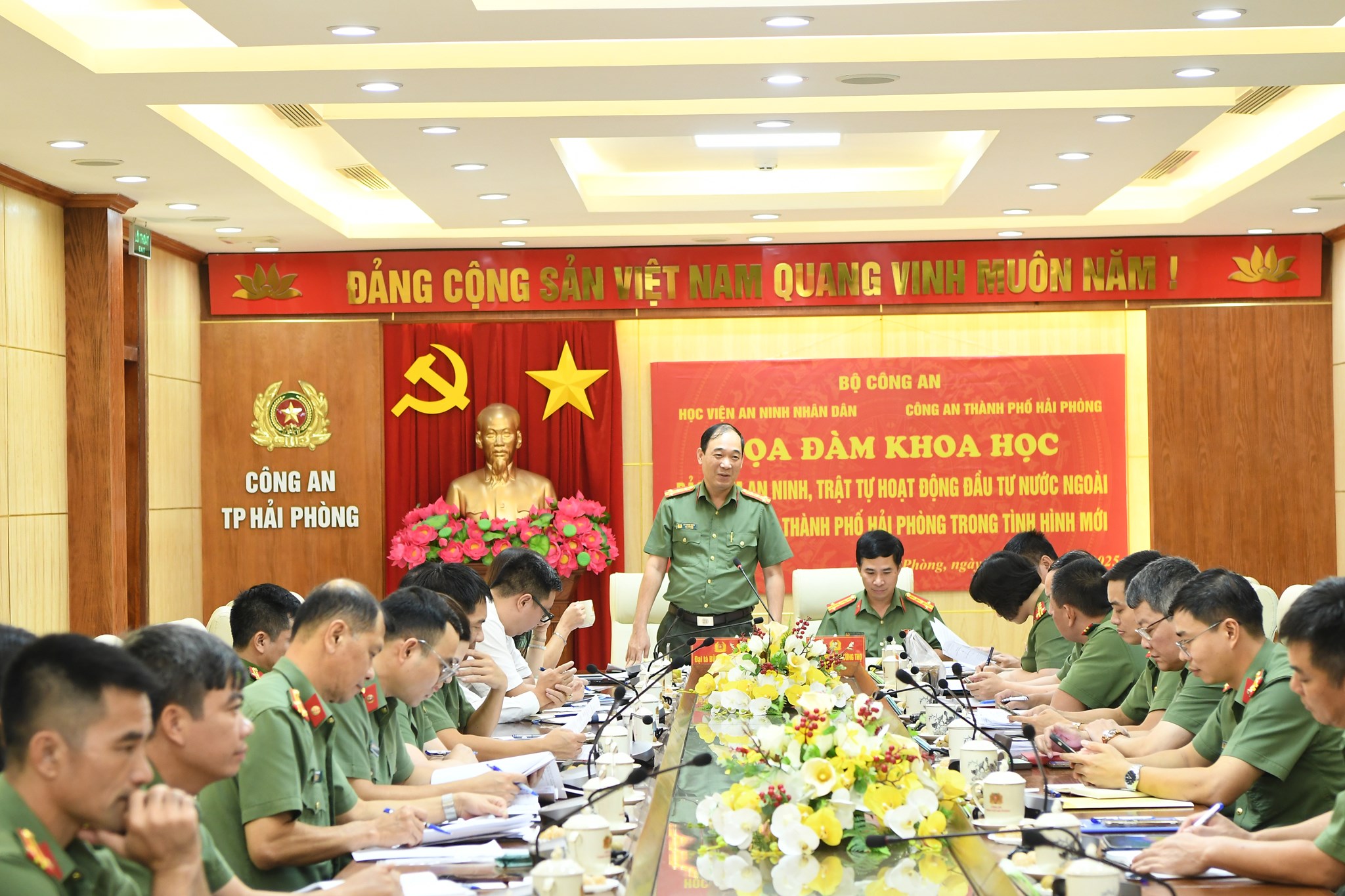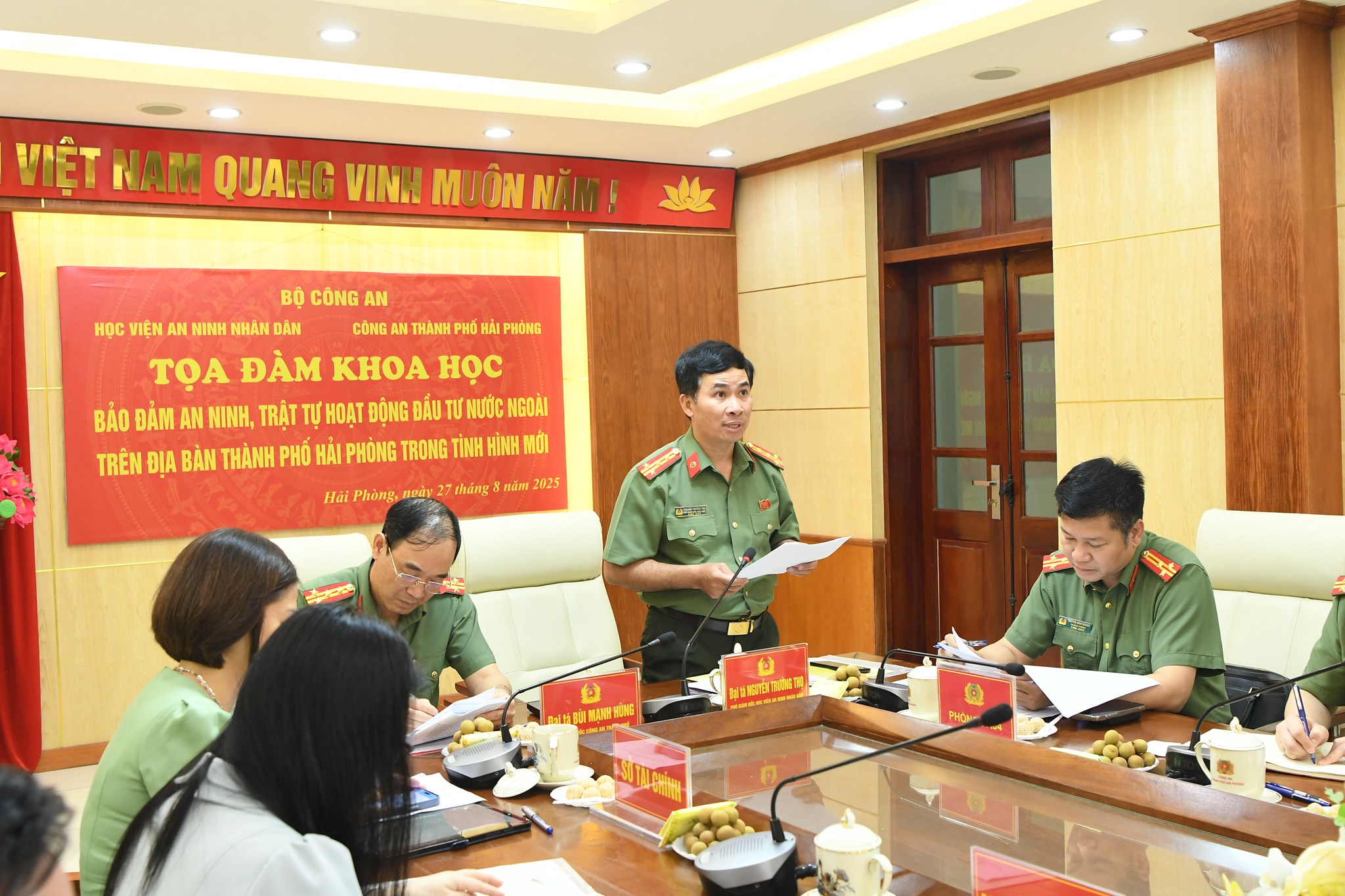 Chiều ngày 27/8/2025, Phòng An ninh kinh tế - CATP Hải Phòng tổ chức Toạ đàm khoa học với chủ đề “Bảo đảm ANTT hoạt động đầu tư nước ngoài trên địa bàn thành phố Hải Phòng trong tình hình mới”. Dự và đồng chủ trì toạ đàm có các đồng chí: Đại tá Bùi Mạnh Hùng - Phó Giám đốc CATP; GS,TS, Đại tá Nguyễn Trường Thọ - Phó Giám đốc Học viên An ninh nhân dân. Cùng dự có đại diện lãnh đạo một số phòng nghiệp vụ trong CATP Hải Phòng; đại biểu các sở, ban, ngành liên quan.
