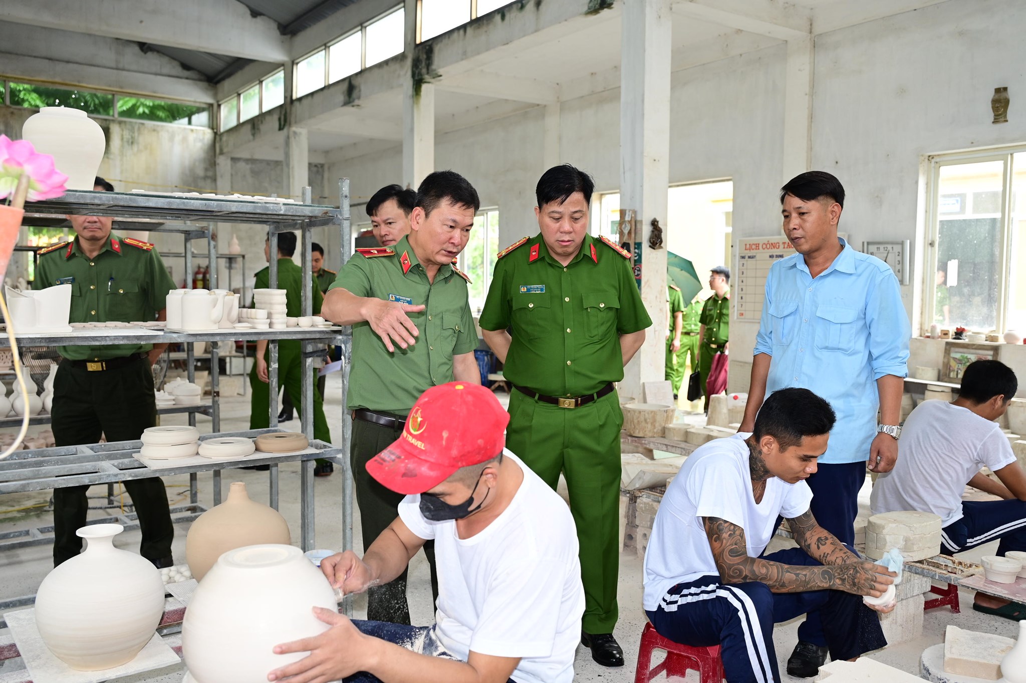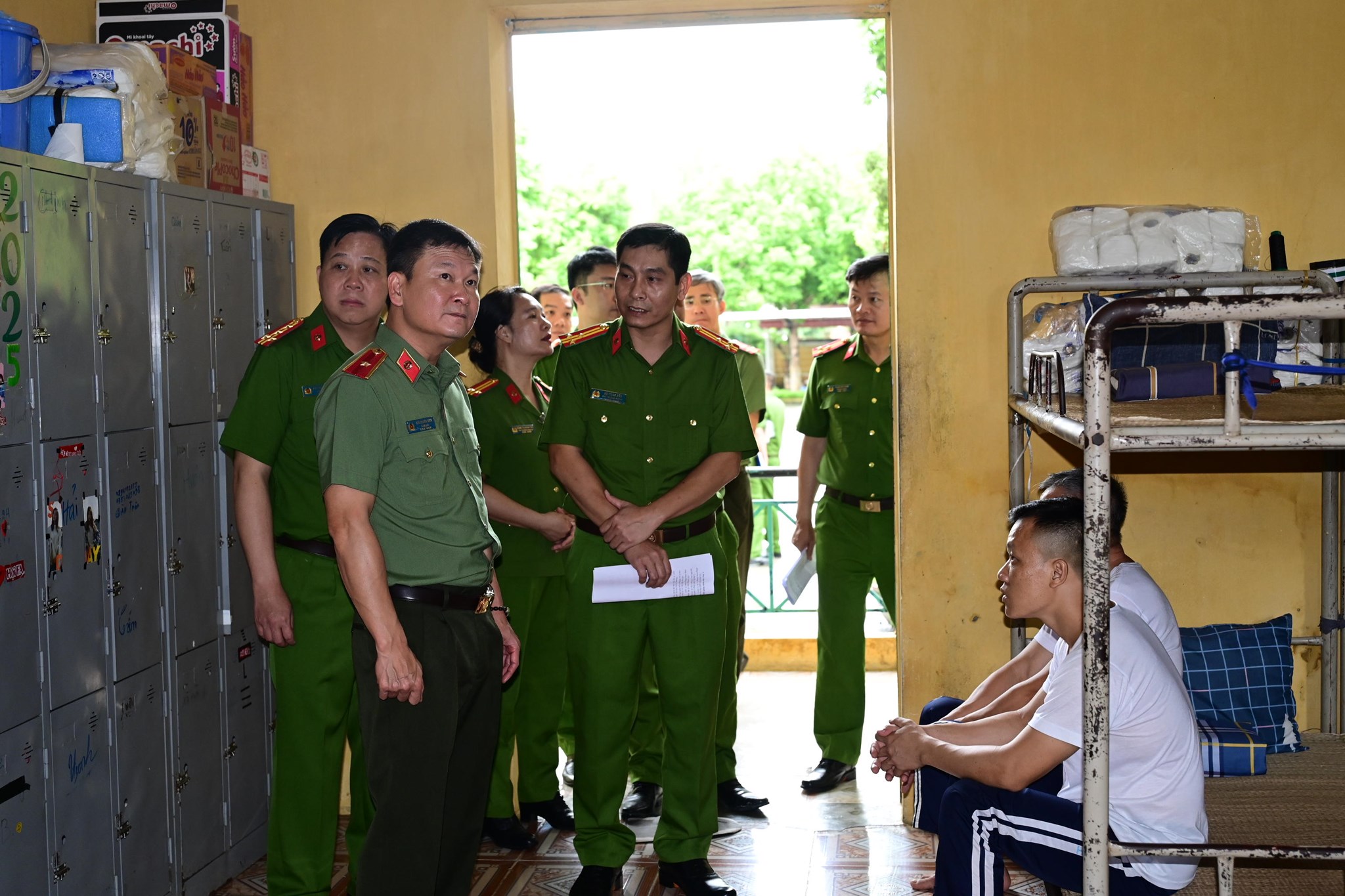 Thiếu tướng Bùi Quang Bình - Giám đốc CATP, Đại tá Bùi Trung Thành - Phó Giám đốc CATP tới thăm khu vực ăn ở, học nghề của học viên