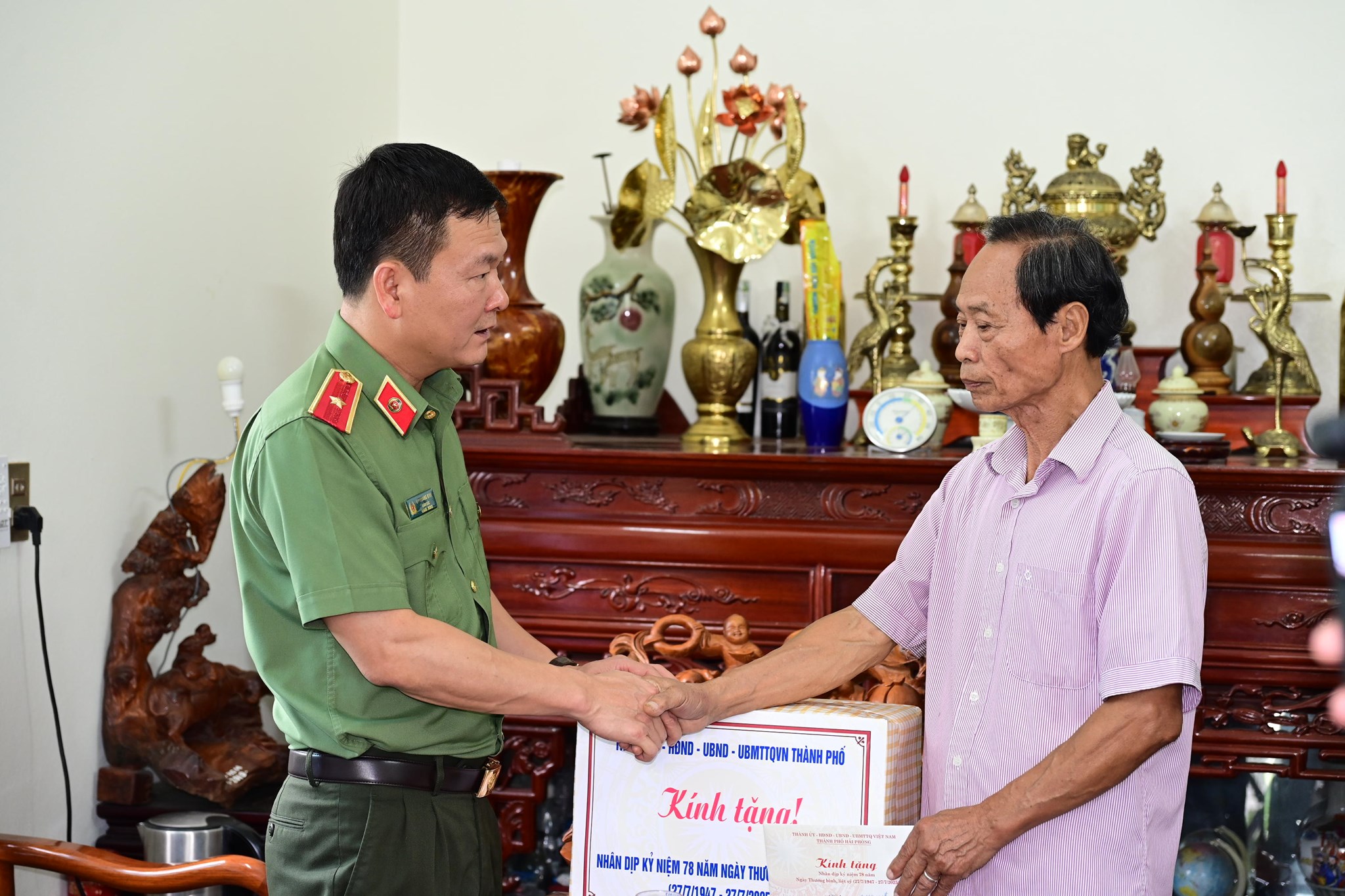 Nhân chuyến công tác, Thiếu tướng Bùi Quang Bình, Ủy viên BTV Thành ủy, Giám đốc CATP đã đến thăm, tặng quà tri ân gia đình ông Vũ Bá Toát, ở Khu Thạch Lỗi, xã Cẩm Giang, cán bộ bị địch bắt tù đày trong thời kỳ kháng chiến chống Mỹ; thăm, tặng quà động viên CBCS Công an xã Cẩm Giang.
