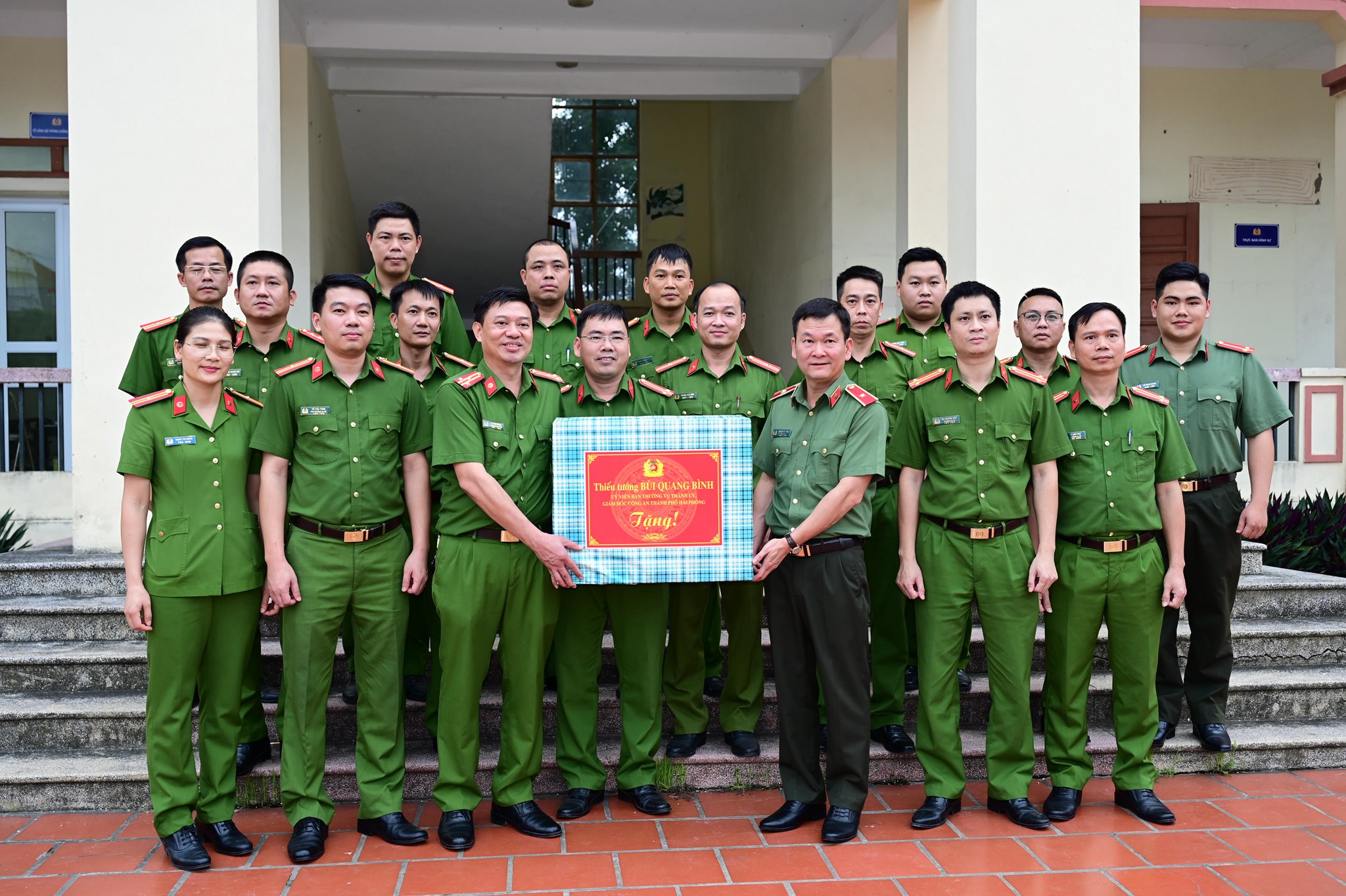 Thiếu tướng Bùi Quang Bình, Ủy viên BTV Thành ủy, Giám đốc CATP tặng quà động viên CBCS Công an xã Cẩm Giang