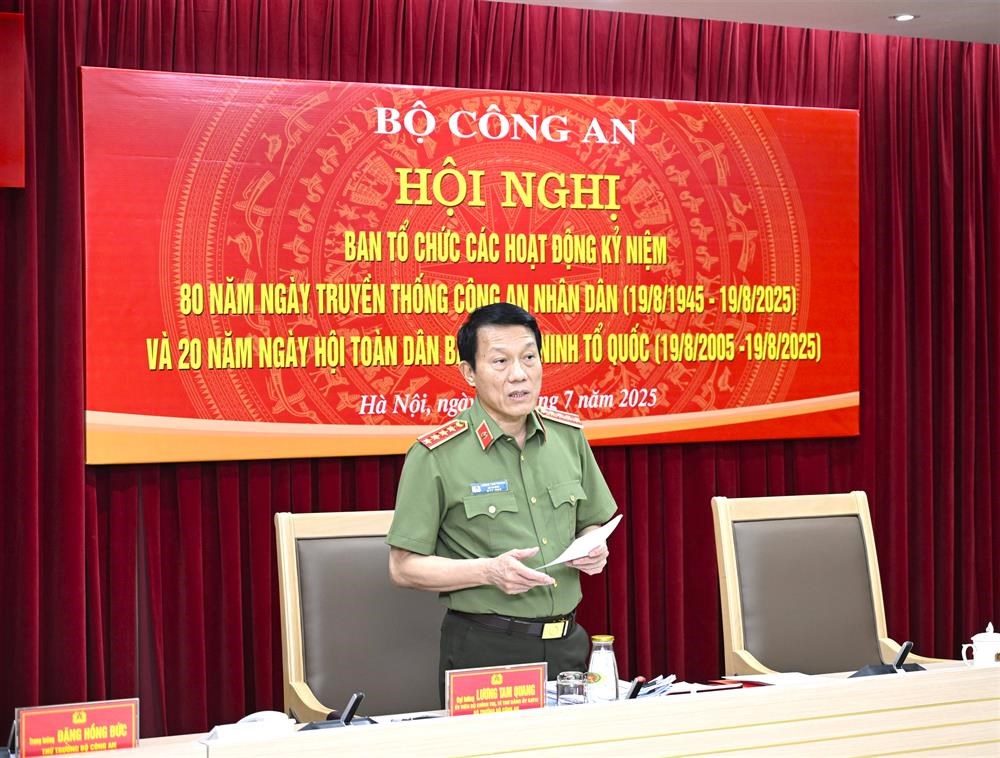 Chiều 10/7/2025, tại Hà Nội, Đại tướng Lương Tam Quang, Ủy viên Bộ Chính trị, Bộ trưởng Bộ Công an, Trưởng Ban Tổ chức các hoạt động kỷ niệm 80 năm Ngày truyền thống lực lượng Công an nhân dân (19/8/1945 – 19/8/2025), 20 năm Ngày hội toàn dân bảo vệ an ninh Tổ quốc (19/8/2005 – 19/8/2025) đã chủ trì Hội nghị Ban tổ chức lần thứ 3. Dự Hội nghị, về phía Bộ Công an có Trung tướng Phạm Thế Tùng, Thứ trưởng Bộ Công an, Phó Trưởng Ban Tổ chức; Trung tướng Đặng Hồng Đức, Thứ trưởng Bộ Công an, Phó Trưởng Ban Tổ chức; đại diện lãnh đạo các đơn vị thuộc Bộ. Về phía khách mời có các đồng chí: Phạm Gia Túc, Ủy viên Trung ương Đảng, Phó Chánh Văn phòng Trung ương Đảng; Đinh Thị Mai, Phó Trưởng Ban Tuyên giáo và Dân vận Trung ương; đại diện lãnh đạo các ban, bộ, ngành Trung ương…