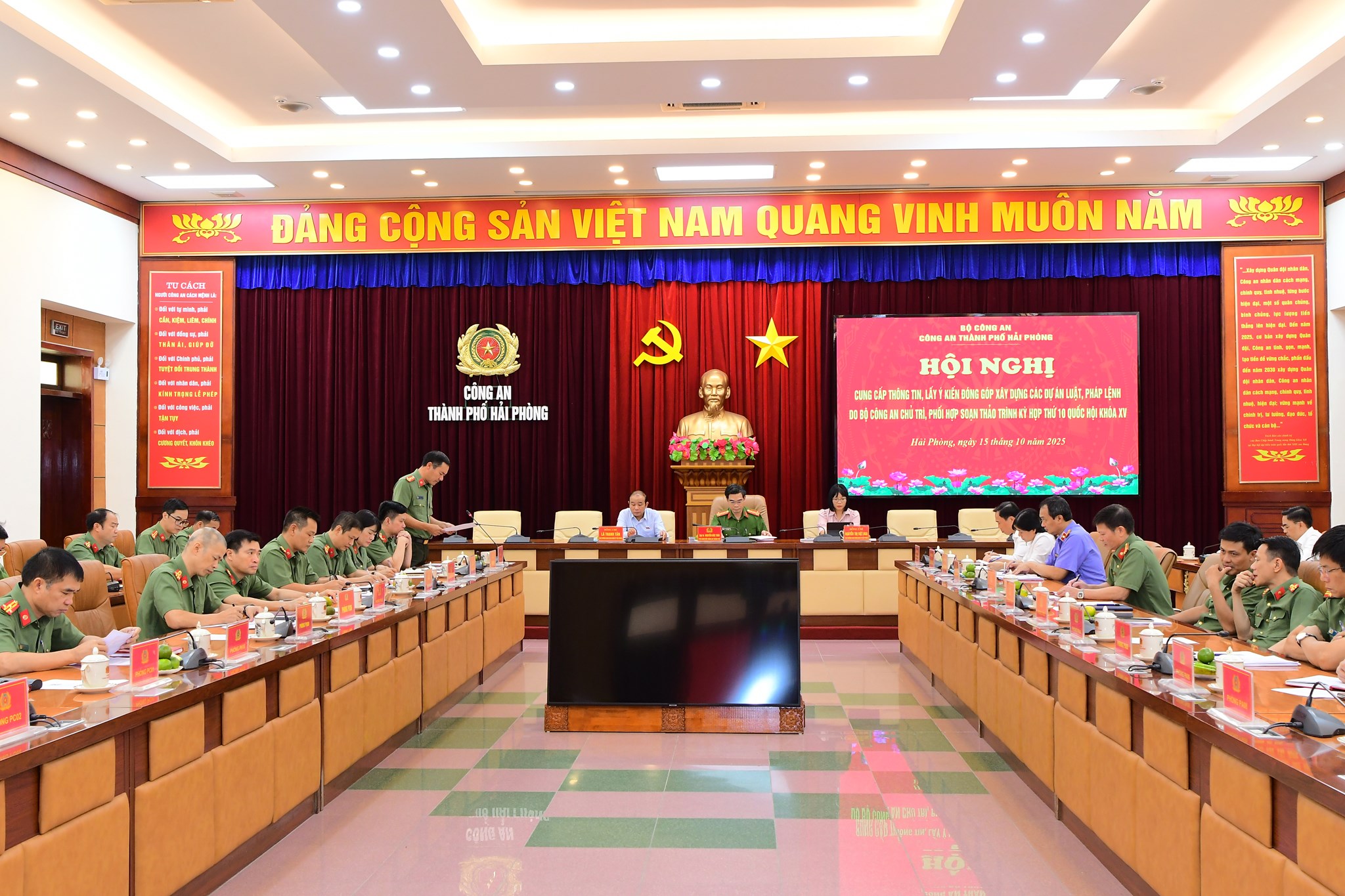 Chiều 15/10/2025, Công an thành phố tổ chức hội nghị cung cấp thông tin, lấy ý kiến tham gia xây dựng 11 dự án Luật, Pháp lệnh do Bộ Công an chủ trì soạn thảo trình kỳ họp thứ 10, Quốc hội khóa XV. Đại tá Nguyễn Đức Thìn, Phó giám đốc CATP chủ trì hội nghị. Cùng dự có các đồng chí: Lã Thanh Tân, Phó trưởng Đoàn ĐBQH Hải Phòng; Nguyễn Thị Việt Nga, Phó trưởng Đoàn ĐBQH Hải Phòng; đại diện lãnh đạo TAND thành phố, Viện KSND thành phố, Sở Tư pháp thành phố; lãnh đạo các Phòng nghiệp vụ CATP; Trưởng Công an các phường, xã: Hòa Bình, Thiên Hương, Lưu Kiếm, Ngô Quyền, Gia Viên, Lê Chân, An Dương, Nghi Dương, Vĩnh Bảo, Tiên Lãng, Hồng Bàng, Hồng An, Hải An, Kiến Minh, Kim Thành, Phú Thái, Nguyễn Đại Năng, Kinh Môn, An Phú.