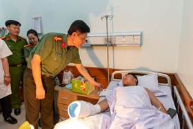 Đại tá Phạm Viết Dũng, Phó Giám đốc CATP thăm hỏi, động viên Thiếu tá Phạm Văn Thắng bị thương trong khi làm nhiệm vụ