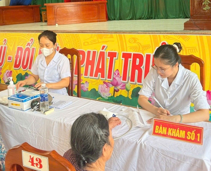 Đội ngũ y, bác sĩ nhân viên y tế Bệnh viện CATP tiếp đón, khám bệnh miễn phí cho bà con Nhân dân xã Gia Lộc