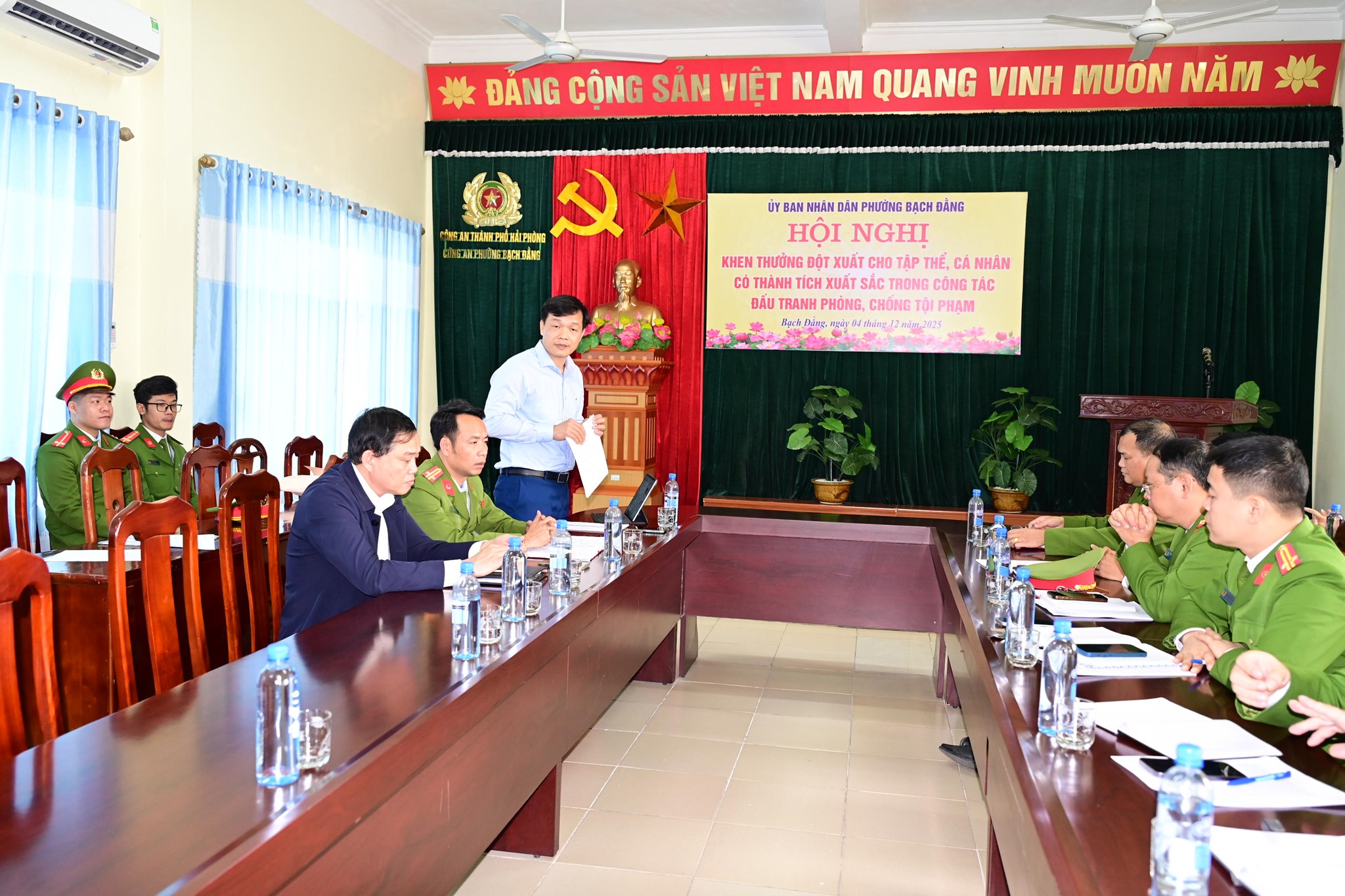 Sáng ngày 04/12/2025, UBND phường Bạch Đằng tổ chức biểu dương, khen thưởng đột xuất tập thể, cá nhân Công an phường Bạch Đằng có thành tích trong công tác đấu tranh, phòng chống tội phạm. Đồng chí Nguyễn Hoàng Minh - Phó Bí thư Đảng ủy, Chủ tịch UBND phường Bạch Đằng dự và chủ trì buổi khen thưởng, cùng dự có đại diện Đảng ủy - HĐND - UBND - UBMTTQVN phường, Ban chỉ huy và cán bộ chiến sĩ Công an phường Bạch Đằng.