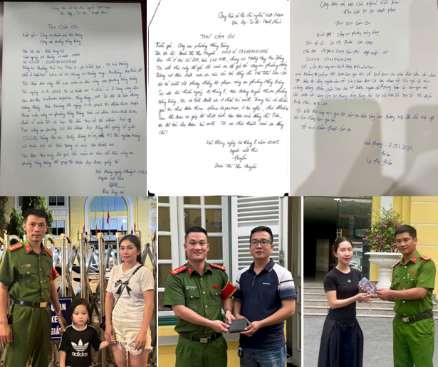 Trước đó, ngày 16/8/2025, chị Đoàn Thị Thu Huyền, trú tại số 208, chung cư Hoàng Huy An Đồng cũng gửi thư cảm ơn tới Công an phường Hồng Bàng và đồng chí Hà Thế Sơn - cán bộ Tổ Cảnh sát Phòng chống tội phạm, Công an phường Hồng Bàng. Theo đó, chiều ngày 13/8/2025, trên tuyến đường thuộc phường Hồng Bàng, chị Đoàn Thị Thu Huyền vô tình đánh rơi 1 chiếc túi xách. Trong túi có nhiều tài sản giá trị như điện thoại Iphone 16 promax, 1 tai nghe, chìa khoá xe, được sự giúp đỡ nhiệt tình, tận tâm của đồng chí Sơn, chị Đoàn Thị Thu Huyền đã tìm lại được túi xách.