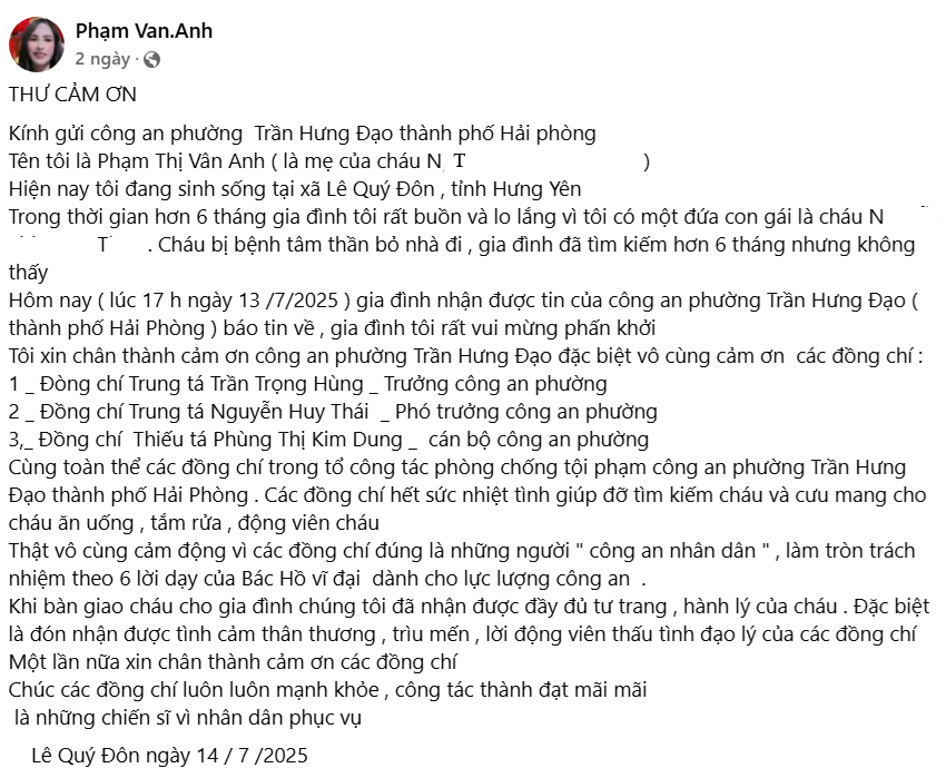 Chiều 16/7/2025, thông tin từ Công an phường Trần Hưng Đạo (Hải Phòng) cho biết đã nhận được thư cảm ơn từ chị Phạm Thị Vân Anh (xã Lê Quý Đôn, Hưng Yên) vì đã giúp đưa con gái trở về đoàn tụ với gia đình sau 6 tháng mất tích.