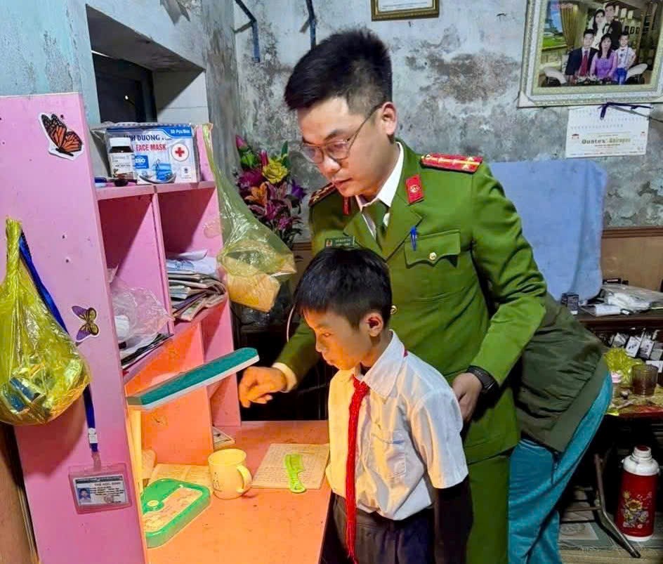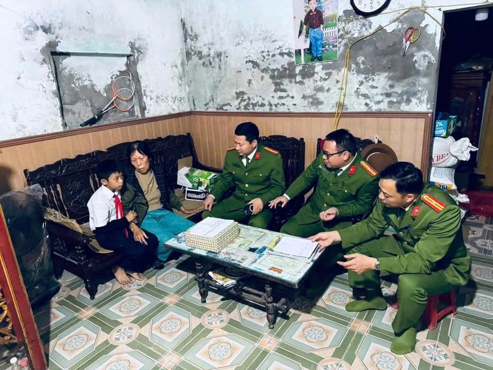 Những bước chân áo xanh đã mang theo cả tấm lòng của lực lượng Công an xã đến với mái nhà đơn sơ. Tại đây, đoàn đã trao tặng cháu Minh những phần quà đầy ý nghĩa như: đèn học, sách vở, đồ dùng và tiền mặt để cháu được đầy đủ hơn trong học tập.