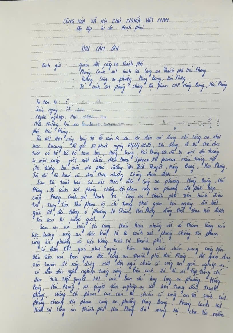 Vừa qua, công dân P.T.B.N, 26 tuổi, trú tại phường Lê Chân, Hải Phòng gửi thư tới Giám đốc Công an thành phố, Phòng Cảnh sát hình sự Công an thành phố Hải Phòng, Trưởng Công an phường Hồng Bàng, Hải Phòng về việc bắt giữ đối tượng, thu hồi và trao trả tài sản bị cướp giật.