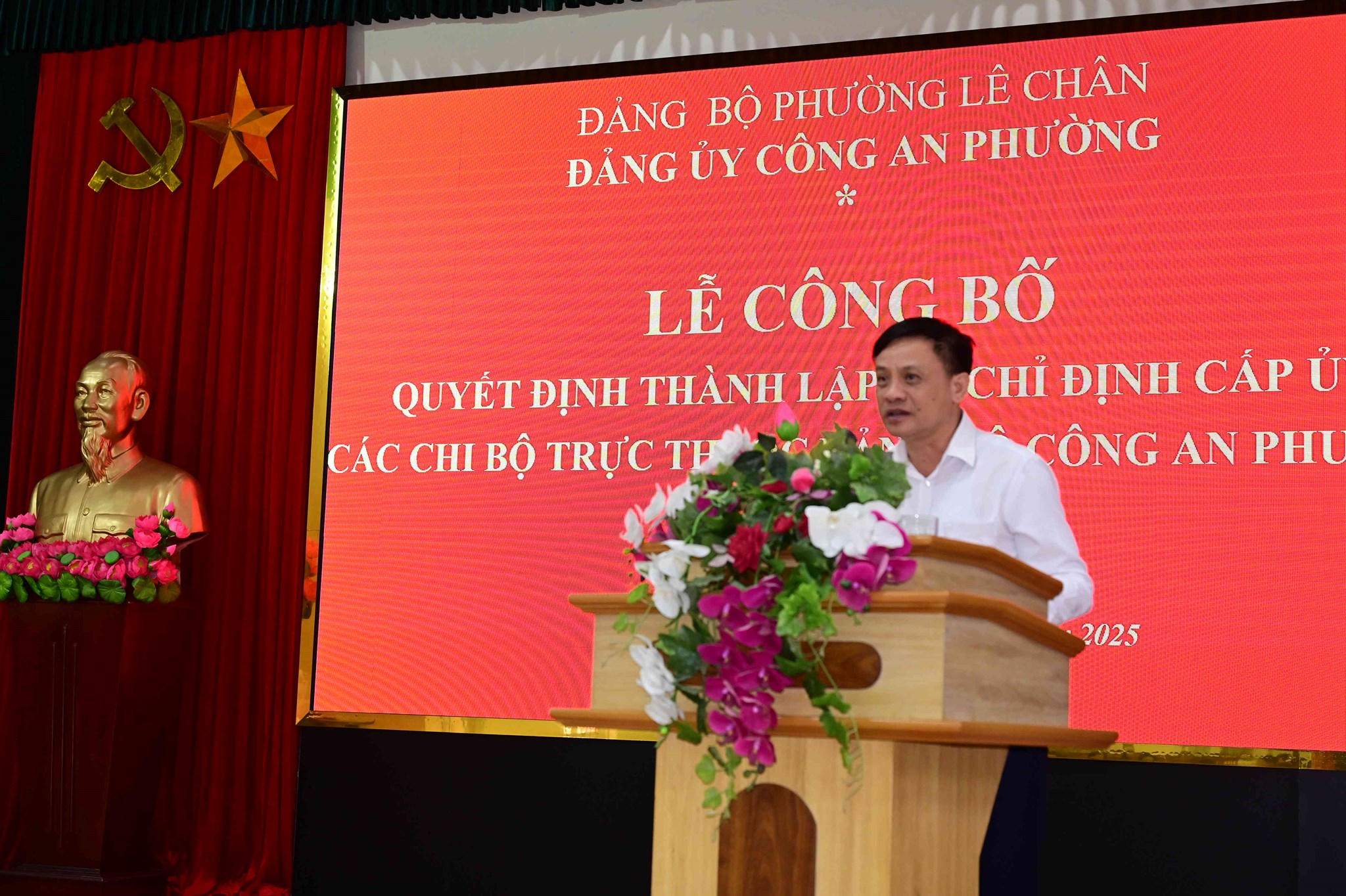 Dự buổi lễ có các đồng chí: Đặng Đông Anh – Ủy viên Thành ủy, Bí thư Đảng ủy, Chủ tịch HĐND phường; Phạm Văn Tân – Phó Bí thư Đảng ủy, Chủ tịch UBND phường; Nguyễn Thị Minh Ngọc – Phó Bí thư Thường trực Đảng ủy phường; Trưởng Ban Xây dựng đảng; Chánh văn phòng Đảng ủy. Tại Hội nghị, Đảng uỷ Công an phường Lê Chân đã công bố các Quyết định về việc thành lập và chỉ định cấp ủy các chi bộ trực thuộc gồm có 5 tổ chức đảng trực thuộc và 162 đảng viên.