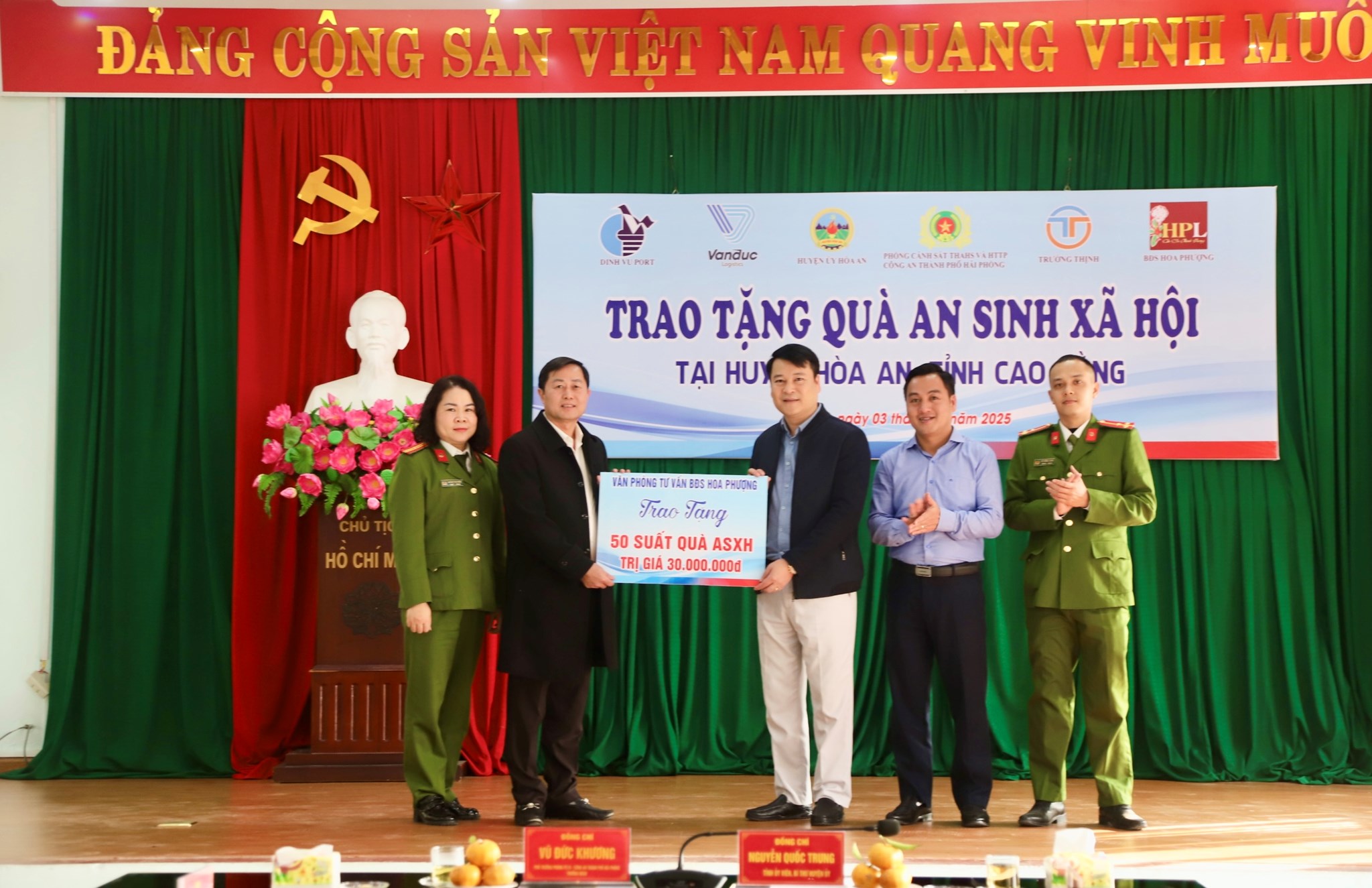 * Trong hai ngày 3 và 4/1/2025, đoàn công tác của Phòng Cảnh sát Thi hành án hình sự và hỗ trợ tư pháp, Công an thành phố Hải Phòng cùng các đơn vị đồng hành, tài trợ gồm Trung tâm Phục hồi chức năng - Đại học Y Dược Hải Phòng, Công ty cổ phần Đầu tư và Phát triển Cảng Đình Vũ, Công ty TNHH Dịch vụ Xuất nhập khẩu Vận Đức; Công ty cổ phần TMXD Trường Thịnh tổ chức các hoạt động an sinh xã hội tại huyện Hoà An, tỉnh Cao Bằng.