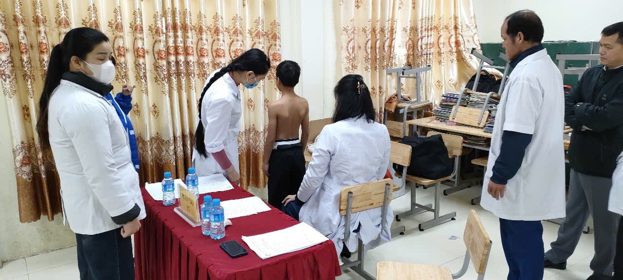 Các y bác sĩ trường Đại học Y Dược Hải Phòng khám sàng lọc vẹo cột sống cho các em học sinh