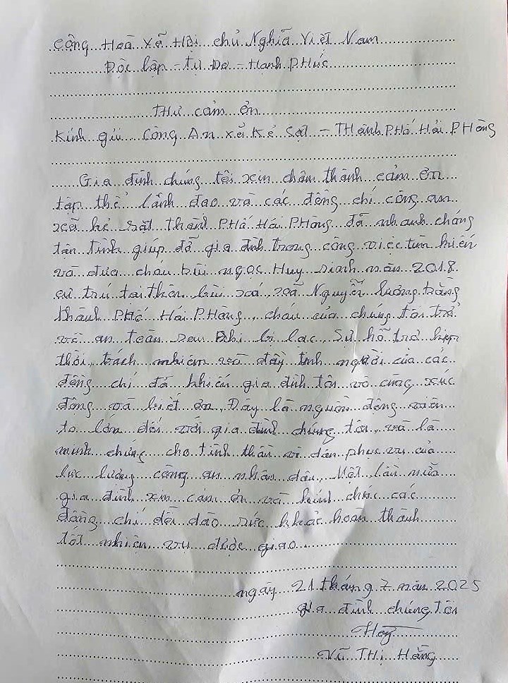 Xúc động trước sự hỗ trợ khẩn trương, kịp thờicủa lực lượng công an xã, gia đình cháu Huy đã gửi thư cảm ơn, trong đó nhấn mạnh: "Sự hỗ trợ kịp thời, trách nhiệm và đầy tình người của các đồng chí đã khiến gia đình tôi vô cùng xúc động và biết ơn. Đây là nguồn động viên to lớn đối với gia đình chúng tôi và là minh chứng cho tinh thần vì dân phục vụ của lực lượng CAND".