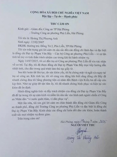 Lá thư của chị Hoàng Thị Phương Anh cảm ơn lực lượng Công an phường Phù Liễn