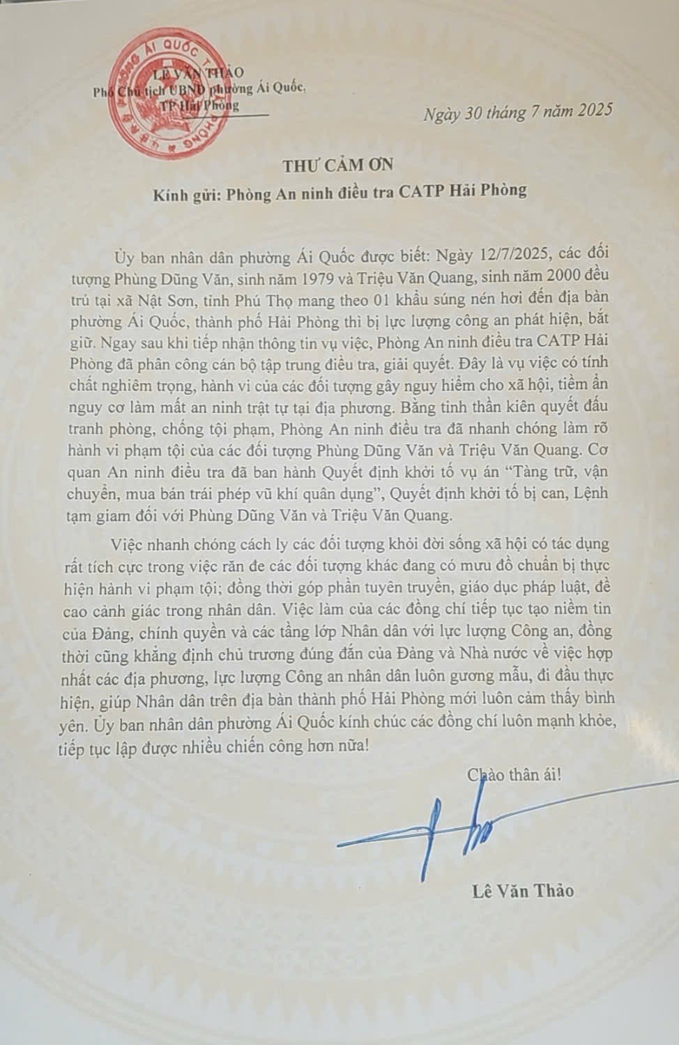Hoà chung không khí thi đua lập thành tích chào mừng thành công Đại hội đại biểu Đảng bộ CATP Hải Phòng lần thứ I, nhiệm kỳ 2025 - 2030 và thiết thực kỷ niệm 80 năm Ngày truyền thống Công an nhân dân Việt Nam (19/8/1945 - 19/8/2025), mới đây, với tinh thần quyết tâm, trách nhiệm cao cùng nghiệp vụ sắc bén, Phòng An ninh điều tra - CATP Hải Phòng đã nhanh chóng phát hiện, xử lý kịp thời vụ án "Tàng trữ, vận chuyển, mua bán trái phép vũ khí quân dụng" xảy ra trên địa bàn xã Ái Quốc, thành phố Hải Phòng. Đơn vị sau đó đã nhận được lá thư cảm ơn đầy ý nghĩa từ đồng chí Lê Văn Thảo, Phó Chủ tịch UBND phường Ái Quốc, ghi nhận những thành tích xuất sắc trong công tác đấu tranh phòng, chống tội phạm, góp phần quan trọng giữ gìn bình yên xóm phố.