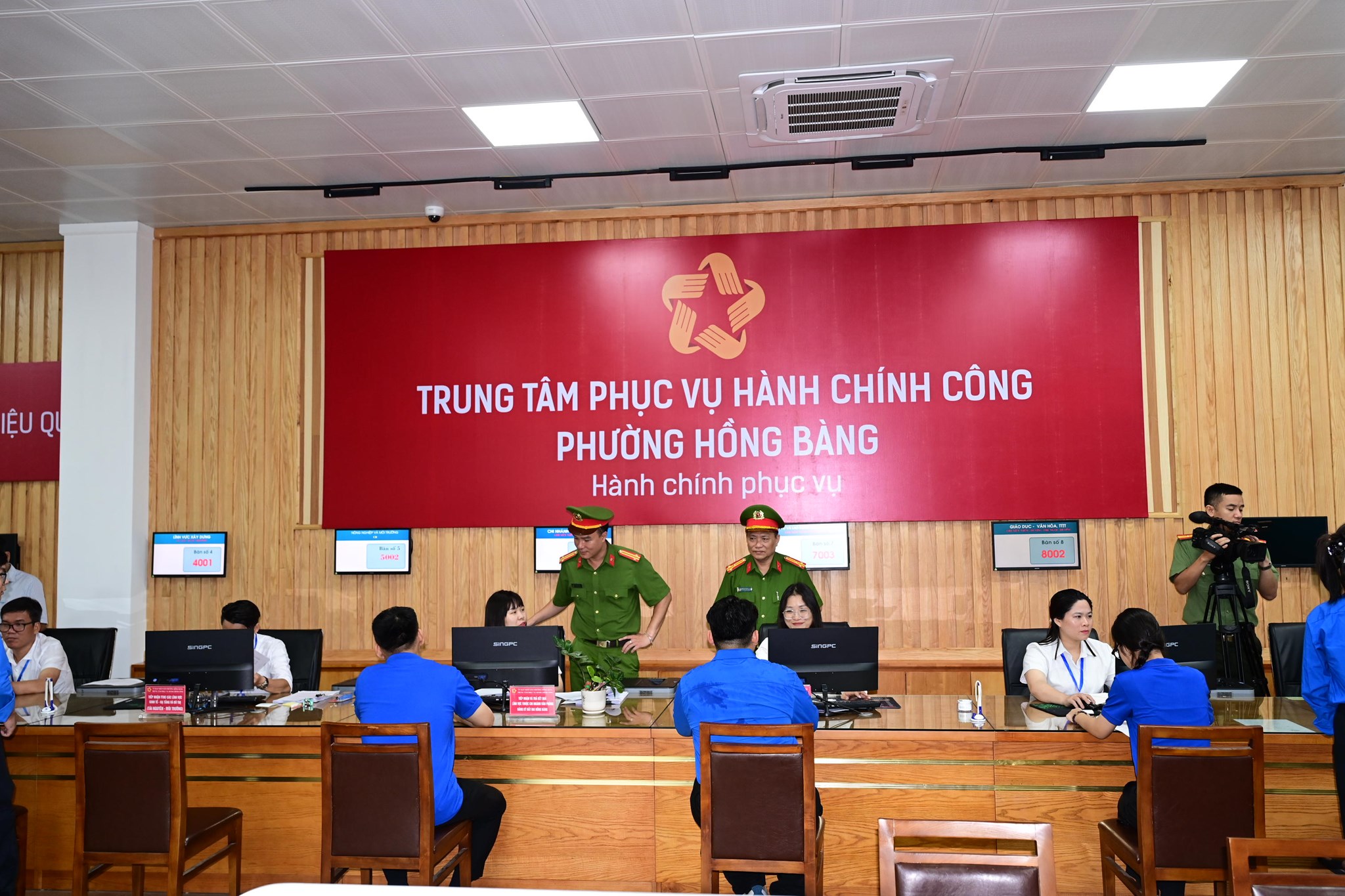 Thượng tá Nguyễn Thành Thuyến - Phó trưởng Phòng Cảnh sát QLHC về TTXH kiểm tra, hướng dẫn tại Công an phường Hồng Bàng