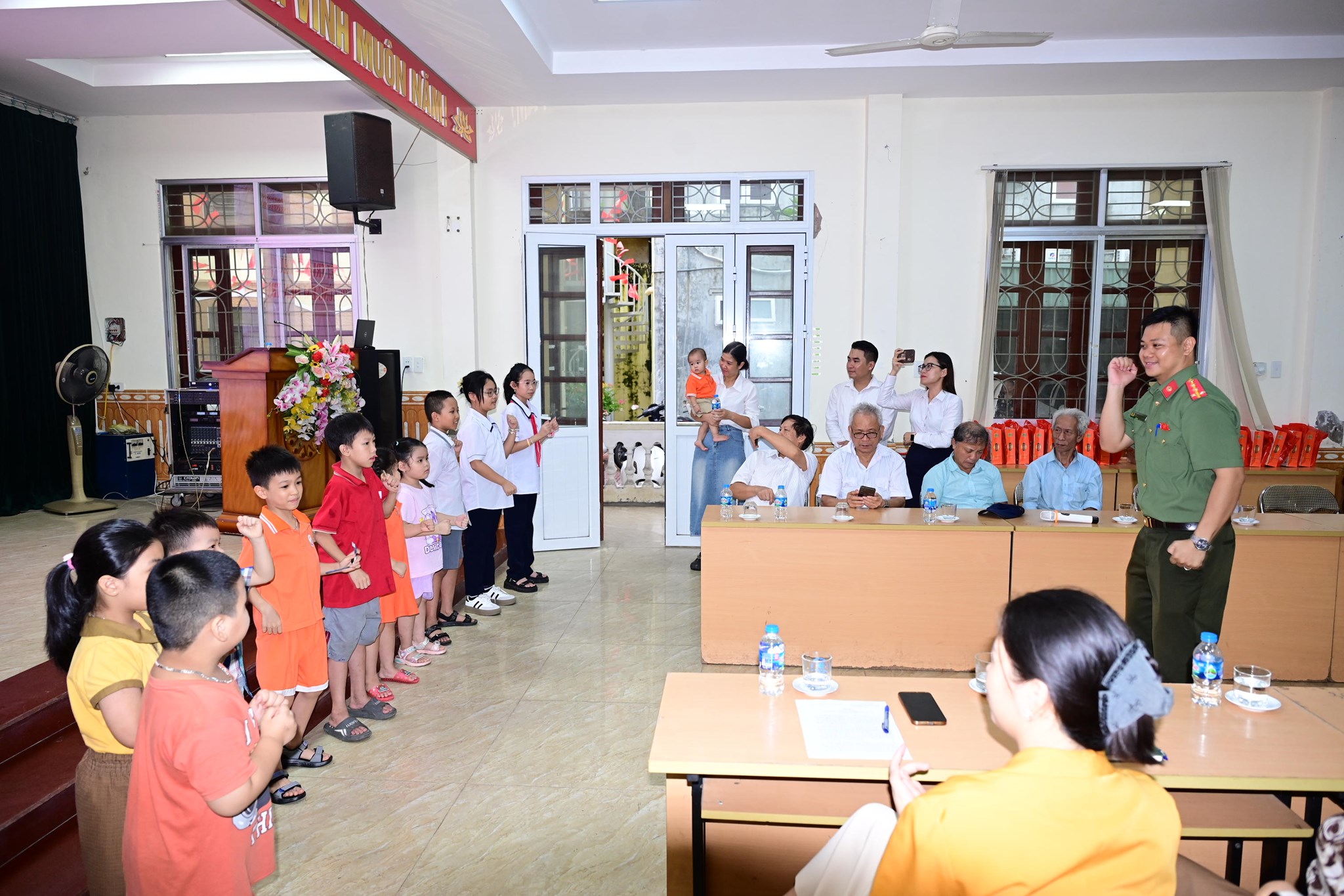 Đại uý Nguyễn Minh Quân - Phó trưởng Ban thanh niên Công an thành phố với các học sinh hoạt động Tết Trung thu