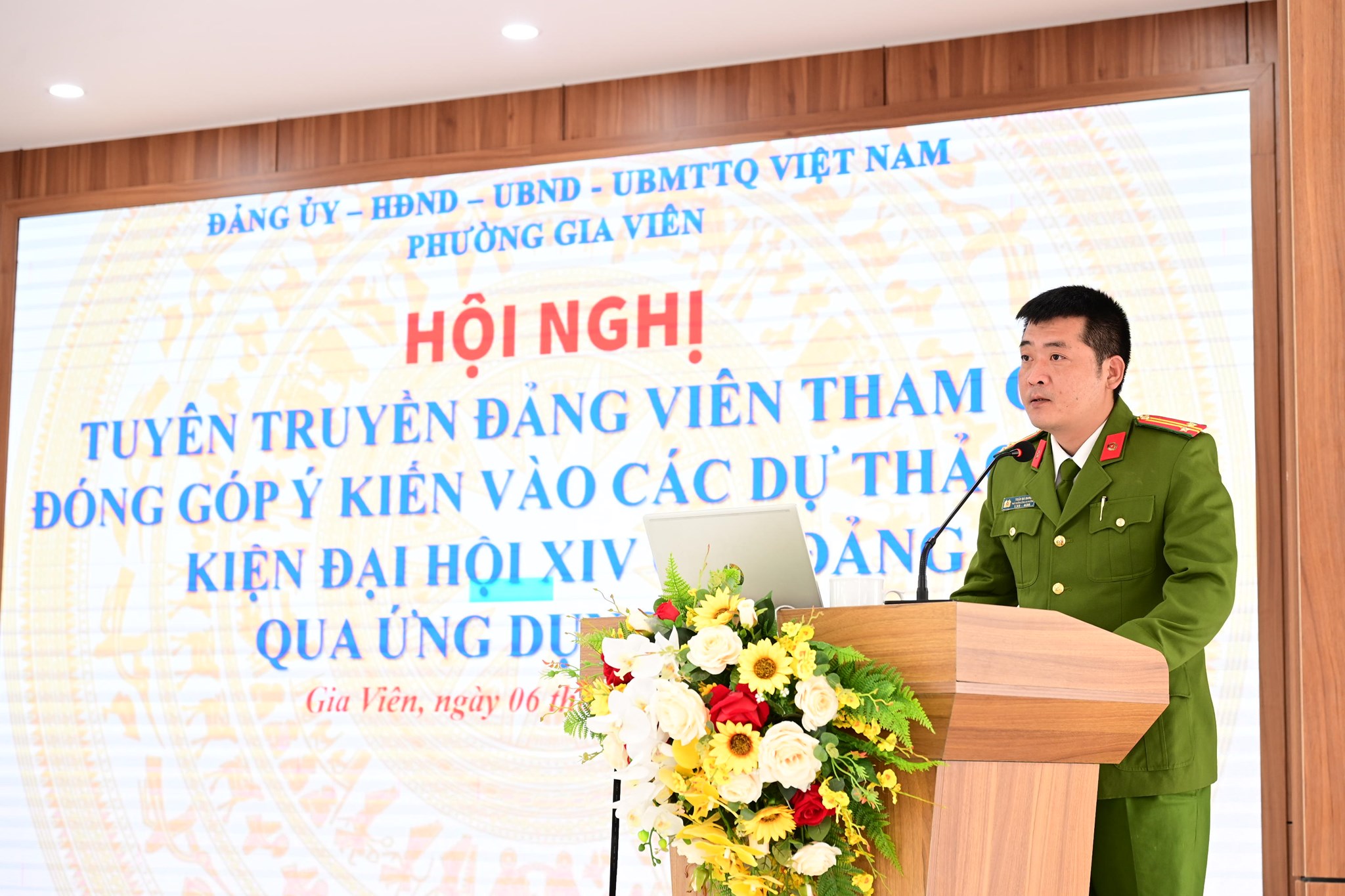 Hiện nay, trên địa bàn phường Gia Viên Báo có 6.266 đảng viên với 10 Đảng bộ cơ sở, 44 Chi bộ cơ sở, 73 Chi bộ tổ dân phố và 17 Chi bộ trực thuộc. Tại hội nghị, Công an phường Gia Viên hướng dẫn các Bí thư chi bộ, tổ trưởng tổ dân phố sử dụng ứng dụng VNeID trên điện thoại thông minh, đăng nhập tài khoản cá nhân, chọn mục “Góp ý văn kiện Đại hội XIV của Đảng” để tham gia ý kiến. Sau đó, các Bí thư chi bộ, tổ trưởng tổ dân phố triển khai tới toàn thể đảng viên trên địa bàn phường. Qua đó nhằm hát huy quyền làm chủ của Nhân dân, góp phần xây dựng Đảng trong sạch, vững mạnh.