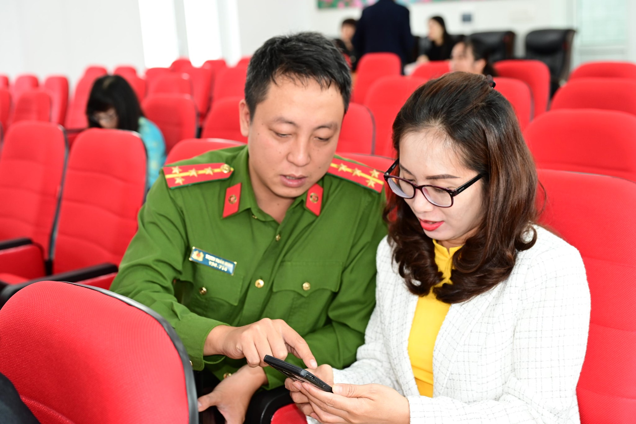 Cán bộ chiến sỹ Công an phường Gia Viên hướng dẫn sử dụng ứng dụng định danh điện tử VNeID