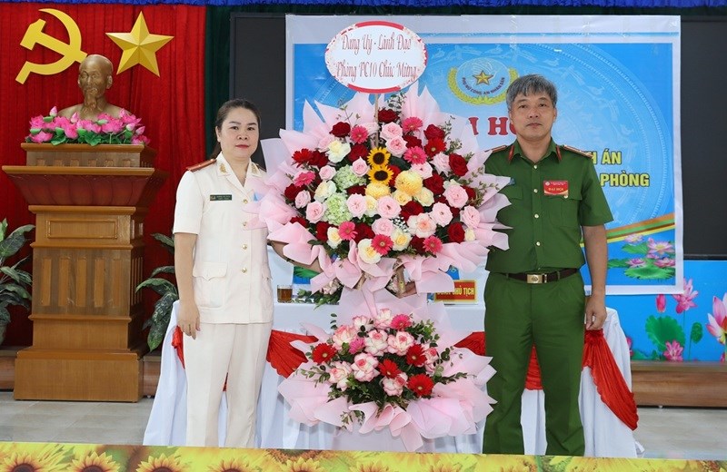Thượng tá Nguyễn Xuân Biếc, Phó Bí thư Đảng ủy, Phó trưởng Phòng Cảnh sát THAHS&HTTP tặng hoa chúc mừng Đại hội