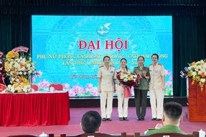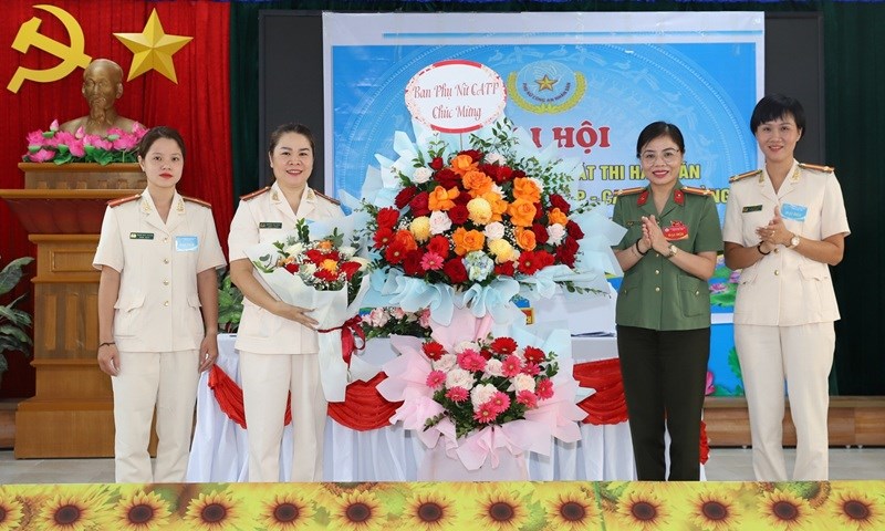 Trung tá Nguyễn Thanh Hà, Phó trưởng Ban Phụ nữ CATP tặng hoa chúc mừng Ban chi hội Phụ nữ Phòng Cảnh sát THAHS&HTTP