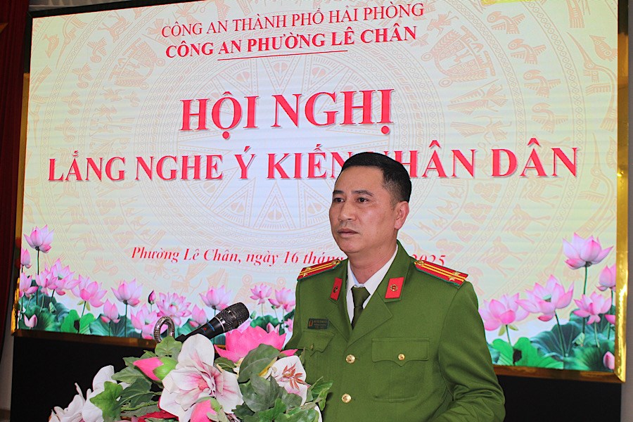 Chiều 16/12/2025, Công an phường Lê Chân tổ chức hội nghị lắng nghe ý kiến nhân dân. Trung tá Nguyễn Trung Kiên - Trưởng Công an phường chủ trì hội ngị. Dự hội nghị có các đồng chí đại diện lãnh đạo các phòng nghiệp vụ Công an thành phố, phường Lê Chân, Bí thư chi bộ, Tổ trưởng, Trưởng ban công tác mặt trận các Tổ dân phố, lực lượng tham gia bảo vệ an ninh, trật tự ở cơ sở cùng toàn thể cán bộ chiến sĩ Công an phường.
