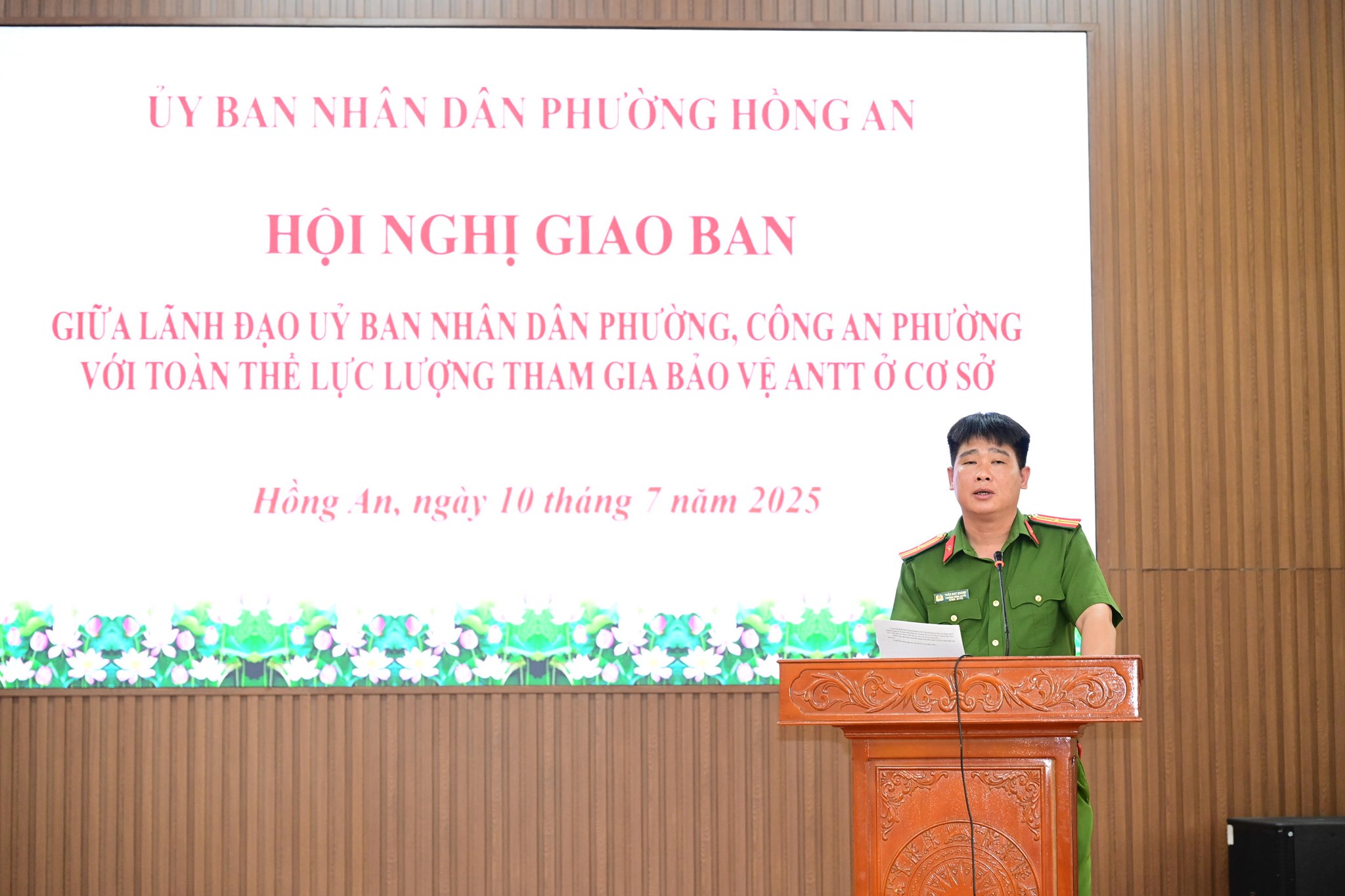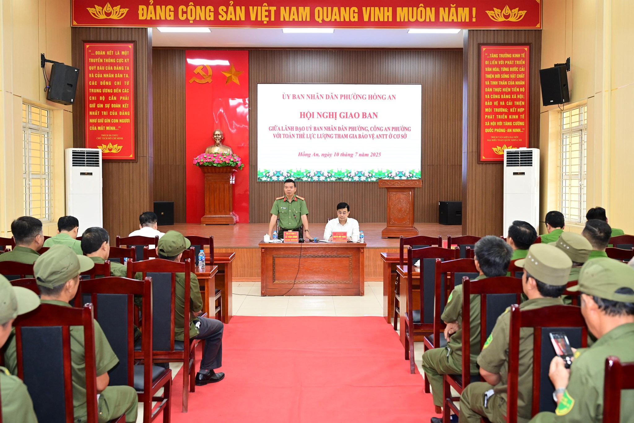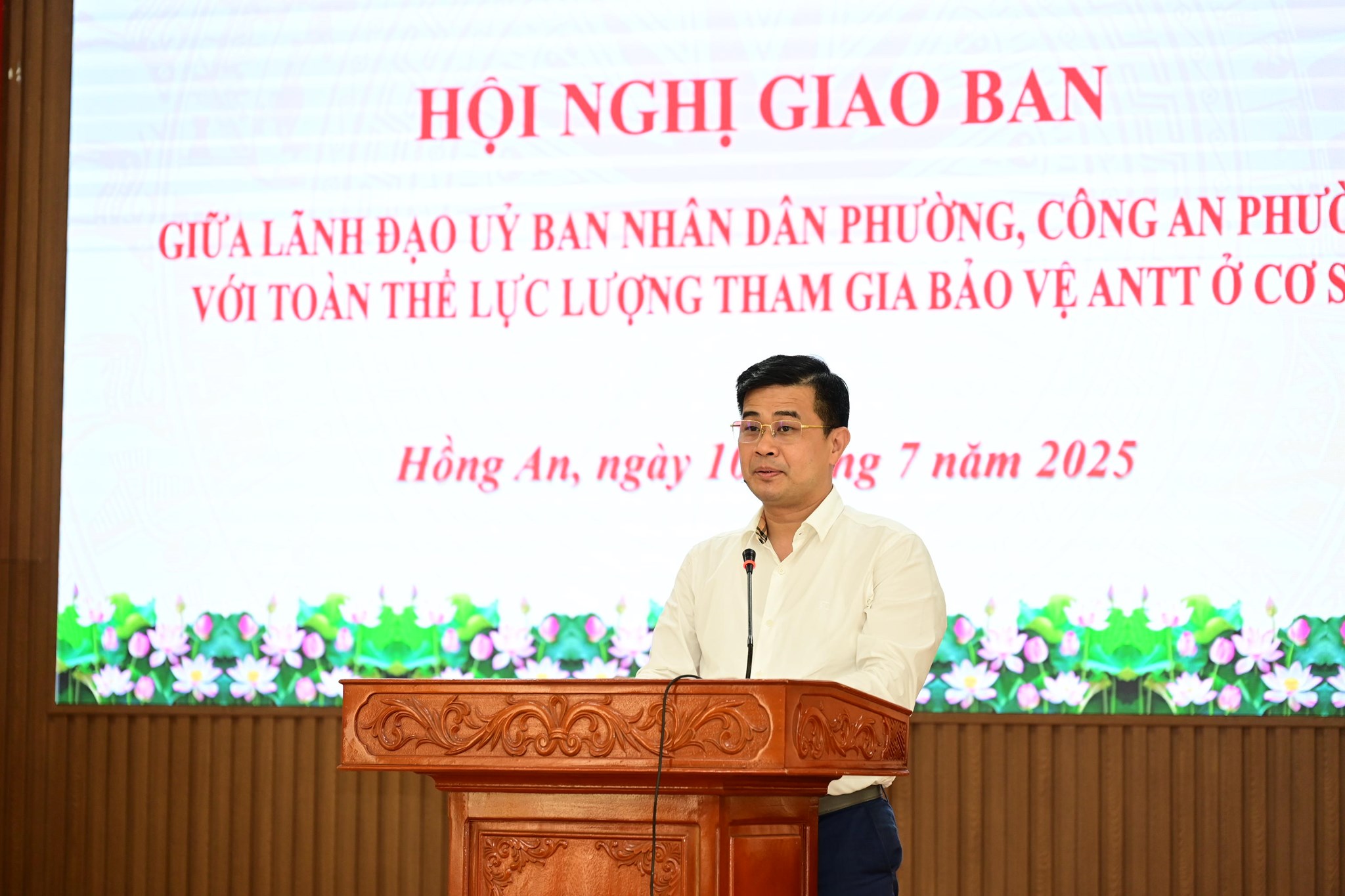 Sáng 10/7/2025, tại Nhà văn hoá phường Hồng An, UBND phường tổ chức Hội nghị giao ban giữa lãnh đạo UBND phường, lãnh đạo Công an phường với toàn thể lực lượng các tổ bảo vệ an ninh trật tự ở cơ sở. Đồng chí Nguyễn Hữu Thanh - Phó Bí thư Đảng ủy, Chủ tịch UBND phường chủ trì Hội nghị.