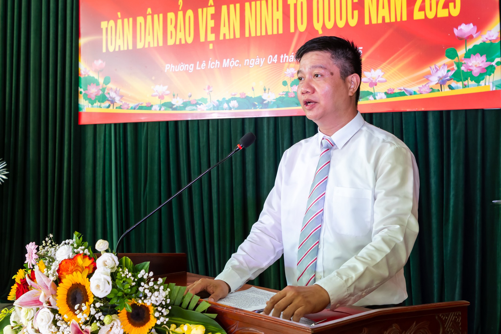 Đồng chí Nguyễn Bá Việt Phương, Phó Chủ tịch UBND phường Lê Ích Mộc báo cáo kết quả công tác xây dựng, phát triển phong trào "Toàn dân bảo vệ ANTQ" tại địa phương